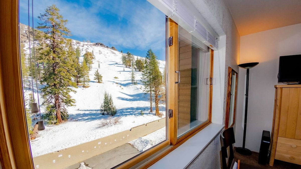 The very best location at Kirkwood: across the street from chairs 5/6--- close enough to come back for lunch--- but private so you don't hear equipment working at night (unlike slopeside). Completely remodeled with top quality finishes in 2024. 2 large bedrooms with comfy king beds and one bunk bed. Open plan full kitchen and living room. Sleeps 5-6 without anyone on a couch. Full kitchen w/DW. Wood fireplace. One covered parking spot in building. Faces quiet courtyard away from the street.