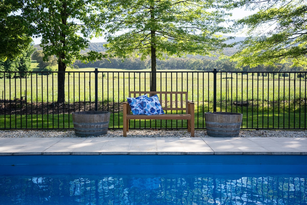 A serene mountain retreat nestled above Wandiligong Valley. Pebblebank on Morses offers pure stillness with panoramic views, calming interiors, king beds with cultiver linen. Cheminee Philippe wood fire, Miele Kitchen, unwind in the yoga snug, breathe in mountain air from the floating deck. French doors open from each bedroom, drift to sleep with the sounds of Morses Creek. A sanctuary for rest, rejuvanation and reconnection, a true mindful escape—crafted for those seeking luxury and peace.