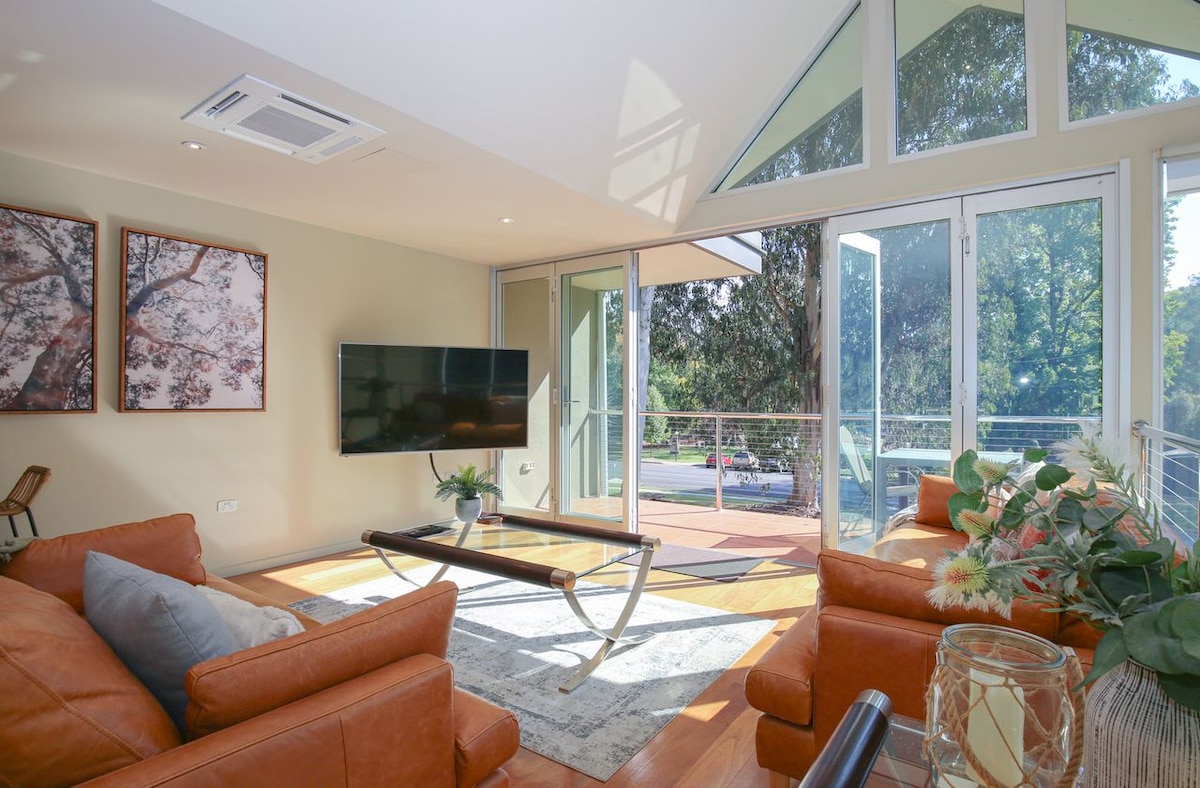 Relax and unwind as the world goes by at the stunning & luxurious Glass Pinnacle townhouse. Centrally located a short stroll from the heart of Bright, with gorgeous views over the river and parklands you won't need your car and you won't want to leave.