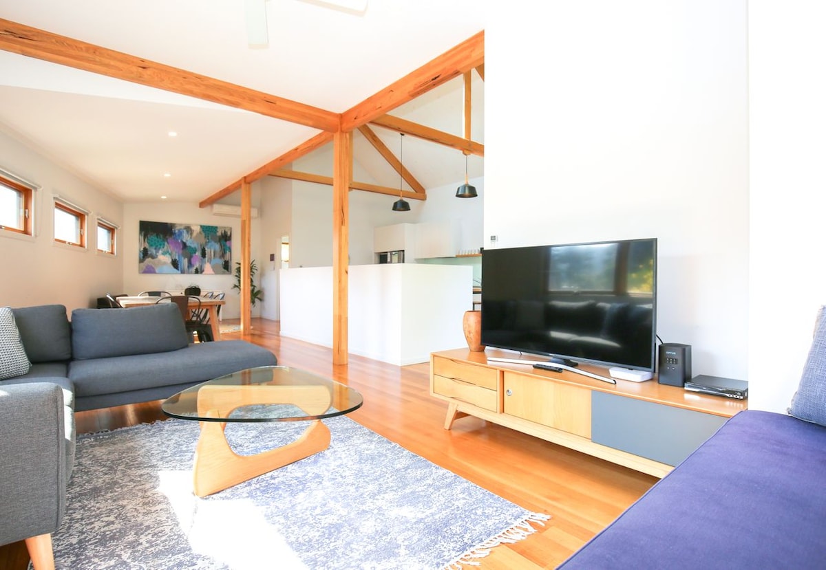 STYLISH AND EVERYTHING ALL NEW Completely gutted and refurbished. New furniture, new bathroom, new kitchenette. No expense spared. Located at the end of a quiet court with its own private, fenced garden Park your car and walk everywhere. Dog park 100m, Ovens River 150m, Bike Trail 2 blocks Town 7 minutes flat, easy walk. Or 10 minutes along the car free riverside walk Owned and operated by Holidaybright Official Site Dogs are 100% welcome inside and out