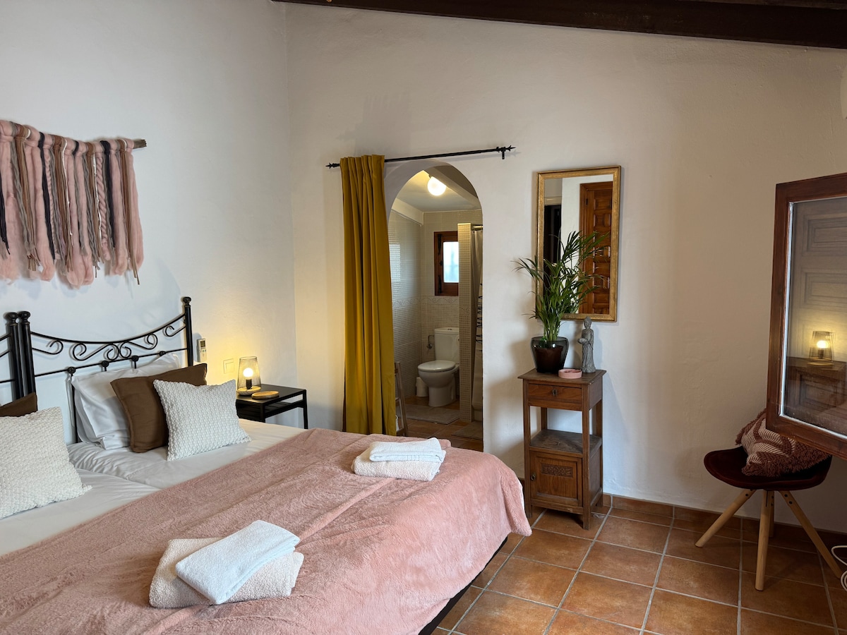 Disconnect from the routine in this unique and relaxing accommodation. "The Love Suite Niwalas is a cortijo for a romantic stay with your partner. There is a large 160cm bed, a bathtub and a kitchen. In front of the cortijo there is a small terrace for dinner or breakfast with views of the peak of the sierra Nevada. There is a fireplace, wifi and AC and washing machine. There is a swimming pool but it is shared with the owners of the house. Nudism allowed