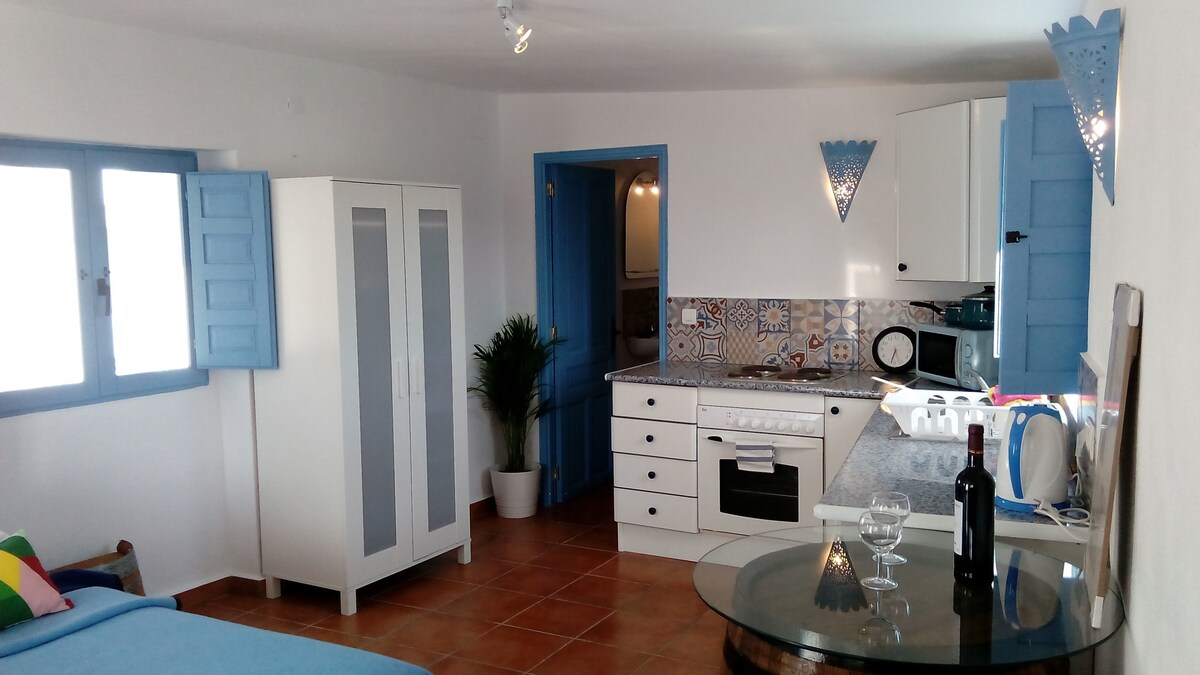 Disconnect from the routine in this unique and relaxing accommodation. "The Love Suite Niwalas is a cortijo for a romantic stay with your partner. There is a large 160cm bed, a bathtub and a kitchen. In front of the cortijo there is a small terrace for dinner or breakfast with views of the peak of the sierra Nevada. There is a fireplace, wifi and AC and washing machine. There is a swimming pool but it is shared with the owners of the house. Nudism allowed