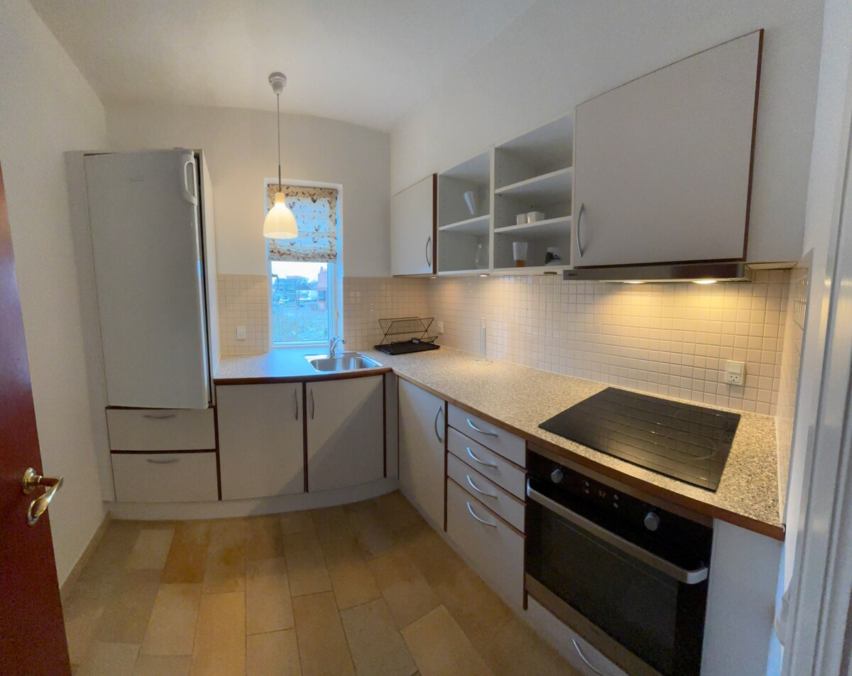 Cozy 50 m² apartment in the heart of Gråsten with charming views of the castle lake and Gråsten Castle. Nearby are shops, restaurants, the harbor, sandy beach, and forest for walks. The apartment offers an open kitchen/dining area for 4, living room with TV, bedroom with double bed and sofa bed, bathroom with shower bench, private terrace, access to a larger common terrace with lake and castle views, laundry (washer/dryer for a fee), and free on-site parking.