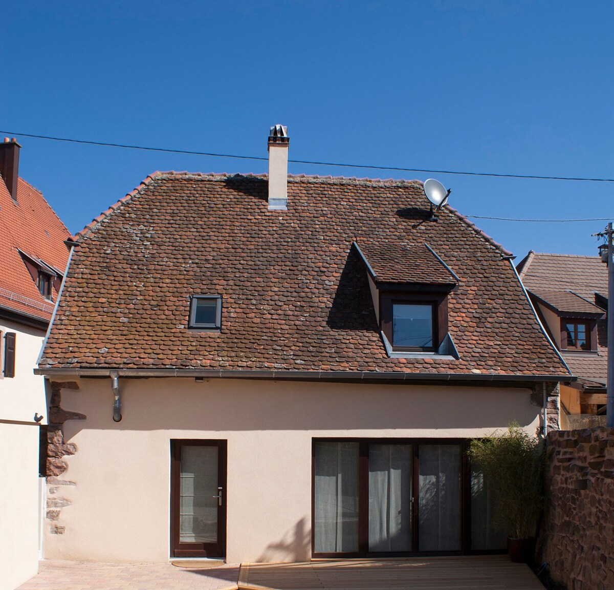 The "Barn" is is part of an old "forgeron" or blacksmith's property - it has been lovingly renovated to preserve all of it's original charm whilst providing an idillic setting to discover the Alsace wine route. Comprising of 2 generous master bedrooms with en-suite and a large open-plan living / dining and kitchen area on the ground floor leading out onto a wooden deck , perfect for enjoying the Alsace climate and local wine . On site parking for two vehicles .