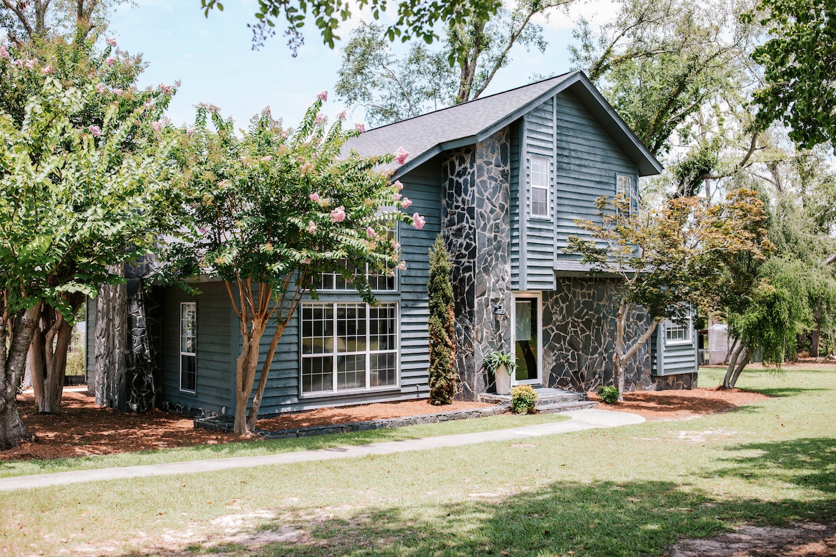 This precious home is located in a sweet little neighborhood right in the center of the City of Baxley! It has two bedrooms, two bathrooms, laundry, living room with fold down sofa, full kitchen and dining space, and covered patio area. We love this little home and hope you'll consider using it as a home away from home! It is just behind our house, so we are pretty readily available for any questions during your stay.