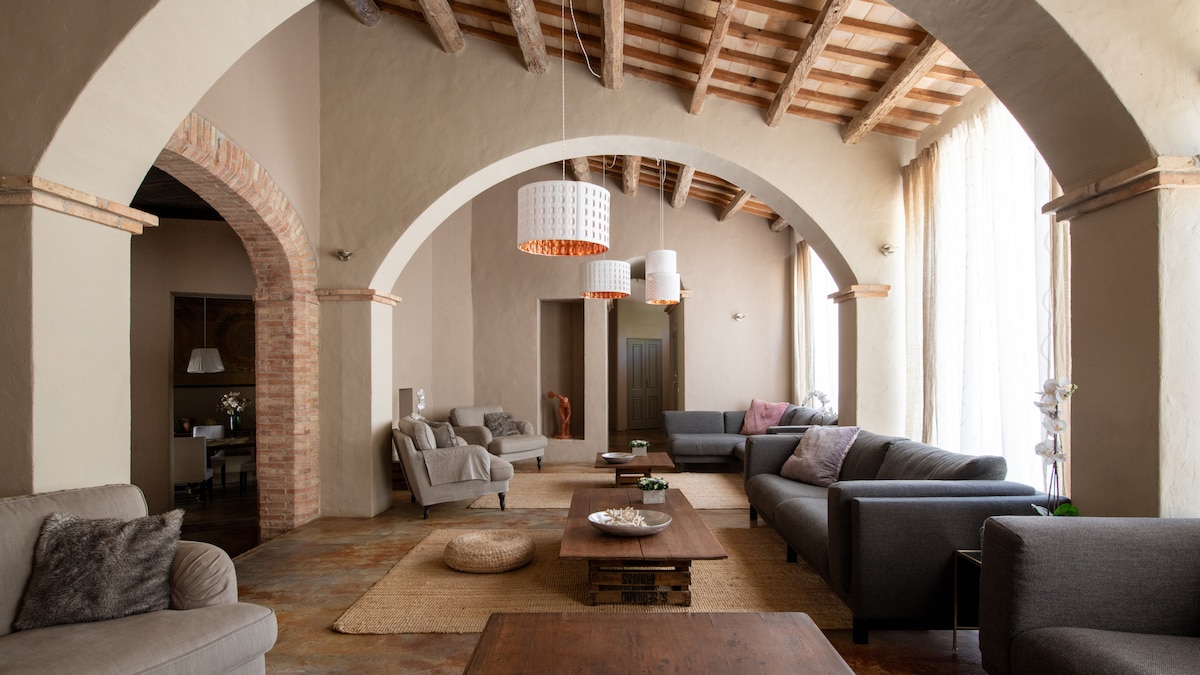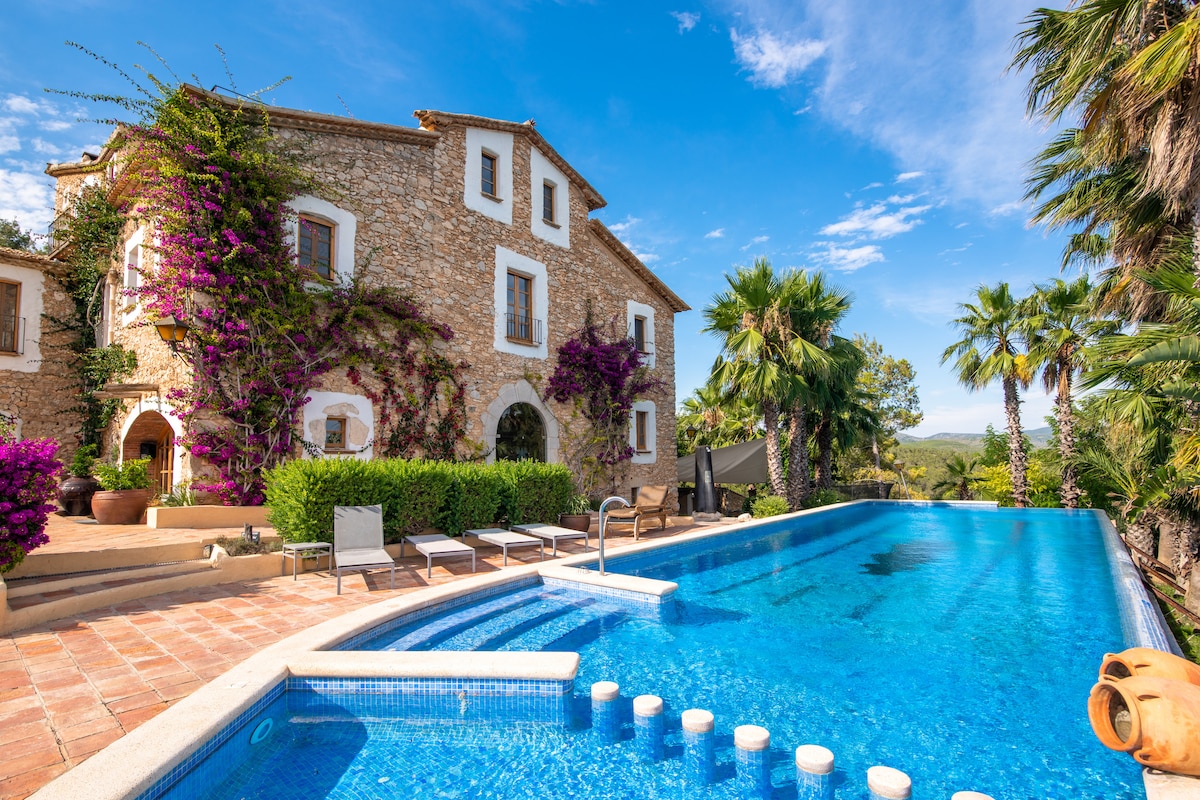 Drive up to the majestic Almiral de la Font villa, situated in the picturesque countryside of Sitges, and you’ll feel as though you’ve time traveled to another era. Sitting proudly on a hillside, the masia—a Catalan manor house—offers picture-perfect views of the Garaf National Park, abounding mountains, and nearby sea. The properties 350 acres are dotted with pear, olive, walnut and almond trees. Vineyards line a few acres too, yielding grapes that produce local favorite: cava.