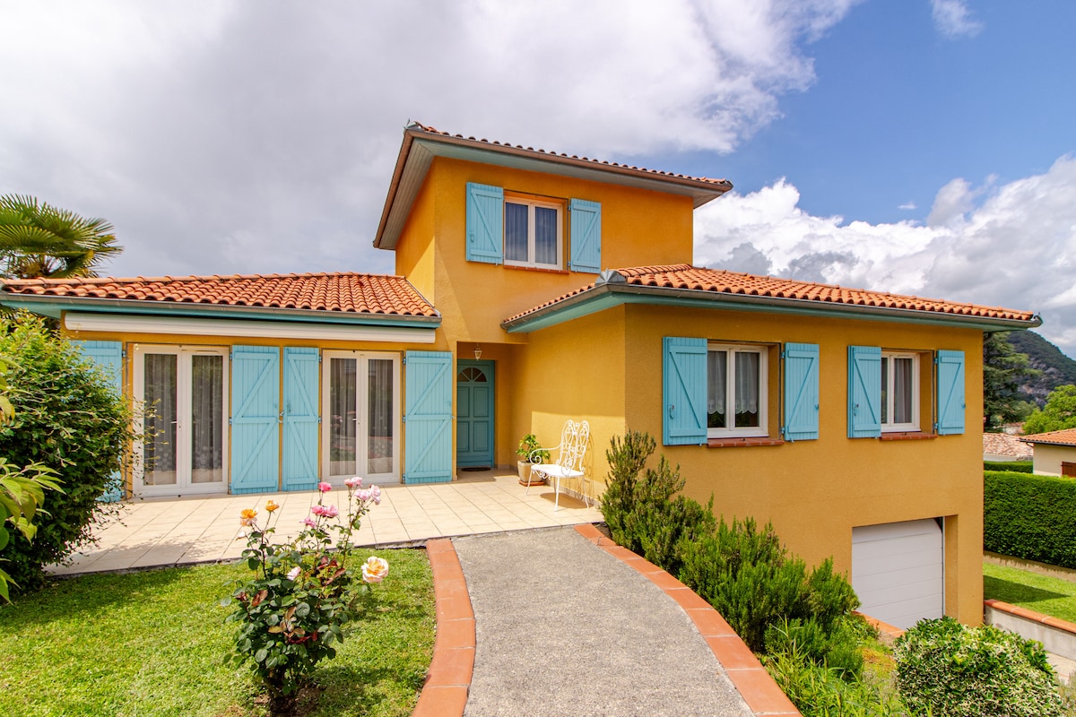 Détendez-vous dans ce logement unique et serein. Profitez d'un magnifique terrain arboré avec une vue exceptionnelle sur la vallée et les montagnes. Réchauffez vous auprès de la cheminée ou rafraîchissez vous grâce à la verdure et la climatisation en couple ou entres amis. Je loue ma maison parcimonie car c'est aussi ma maison principale. Je vous confie donc mon havre de paix dans un ecrin de verdure avec tout le confort et ma petite touche personnelle. [pour le jaccuzi faire la demande]