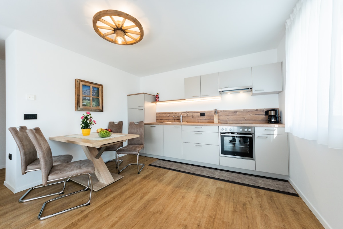 Studio with floor-to-ceiling windows, a modern kitchen, an open bathroom and a balcony with a view to the Dolomites. Studio with king-size bed / south-facing sunny balcony / floor-to-ceiling windows / sofa bed / HD LED TV / fully equipped branded kitchen / bathroom with walk-in rainshower / floor heating / high-speed WIFI / 40 m² / 1-2 persons. SPA: steam bath, Finnish sauna, bio sauna, cold-water pool, relaxation area, XXL infinity whirlpool, swimming pool. CrossFit Box – Gym.