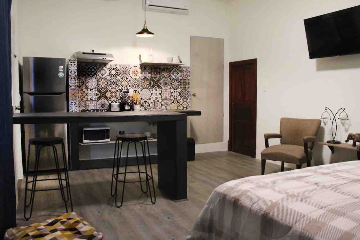 Pequeño departamento vintage con estilo y decoración antiguo muy acogedor en planta alta con acceso independiente ideal para vivir una gran experiencia. El departamento se encuentra a media cuadra de la Ave Hidalgo (Ave principal de Tampico que cruza la ciudad) en un zona segura y tranquila muy cerca de áreas turísticas. Ideal para 3 personas, 2 compartiendo cama matrimonial y 1 en cama individual dentro de la misma habitación, aire acondicionado mini-split en la habitación.