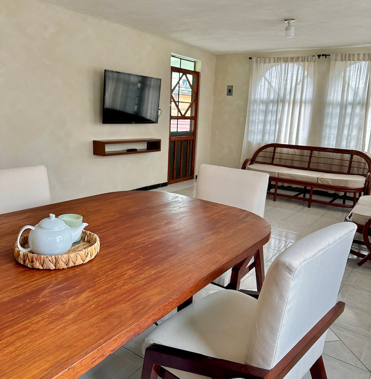 "Nuestro departamento esta a 5 minutos en carro de playa Miramar. Cuenta con cocina equipada con estufa, horno, licuadora, cafetera, utensilios básicos de cocina; Un baño completo con agua caliente. La habitación principal cuenta con MiniSplit, 1 camas matrimonial y una Queen sice y closet amplio. Otra habitación con una cama Quin Size (sin aire acondicionado) . Sala de estar con una pantalla de 40 pulgadas, WIFI, y tv por cable. terraza con asador, mesas y sillas.
