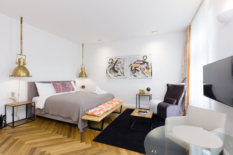 The around 30m² large studios are located in the fully converted attic of the Art Nouveau house. From here you can enjoy the most diverse views: Some look directly at St. Stephen‘s Cathedral, others at the unique geometric metal rivet decor of the former commercial court in Riemergasse. All studios have an anteroom with a fully equipped, modern kitchenette, a comfortable living/bedroom with 2 beds and a bathroom with toilet.
