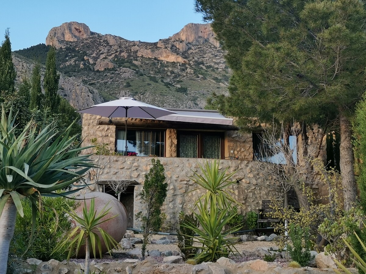 Casa refugio con piscina privada, ubicada al lado de las rutas senderisticas y puntos de escalada de Cabezó de Or y Cuevas de Canelobre. Se puede disfrutar de la tranquilidad, plena naturaleza y vistas panoramicas al mar y montaña a la vez . Ideal para pasar fin de semana haciendo deporte o para descansar. Sitio ideal para hacer barbacoa en entorno privado. A penas 12-15 km de la playa de Campello y San Juan Alicante. Casa se encuenta dentro de la finca de nuestra propiedad.
