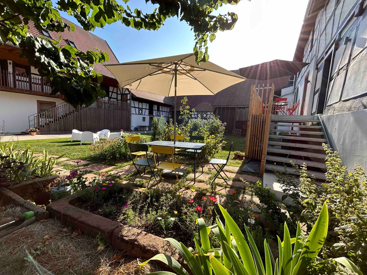 Ce grand studio rustique, indépendant et accueillant, est aménagé dans une ancienne grange avec poutres apparentes, au cœur d'un petit village alsacien typique à l'écart des sentiers touristiques. La gare à trois minutes à pied vous ouvre les portes de l'Alsace. Idéal pour jeune couple.