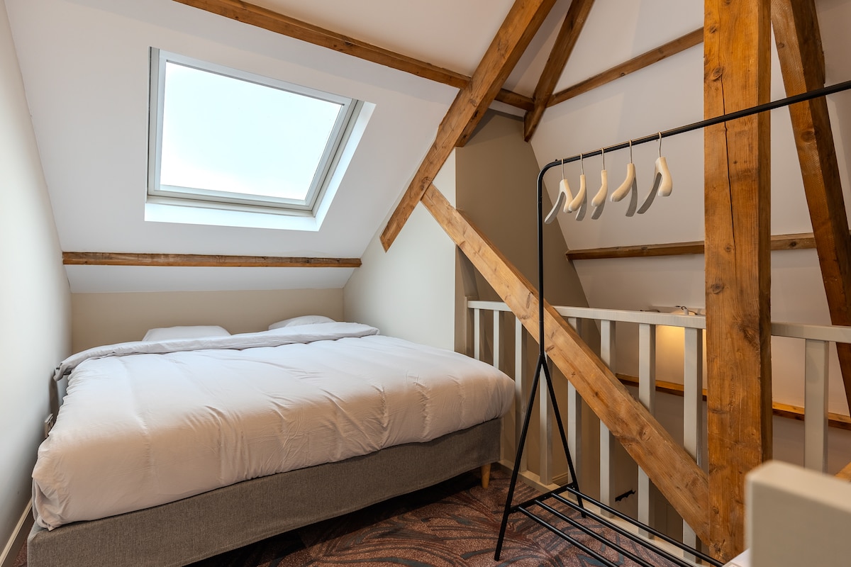 Het appartement bevindt zich op de tweede verdieping boven het atelier. Er is een tweepersoonsbed aanwezig. In de ruime slaapkamer kan op verzoek een volwaardig extra bed worden bijgeplaatst voor een derde gast. Daar betaalt u €25,00 extra per nacht voor. U hebt beschikking over een slaapkamer en eigen badkamer. Daarnaast is er een woonkeuken met een complete keuken. U bereikt het appartement via een eigen ingang met trap.