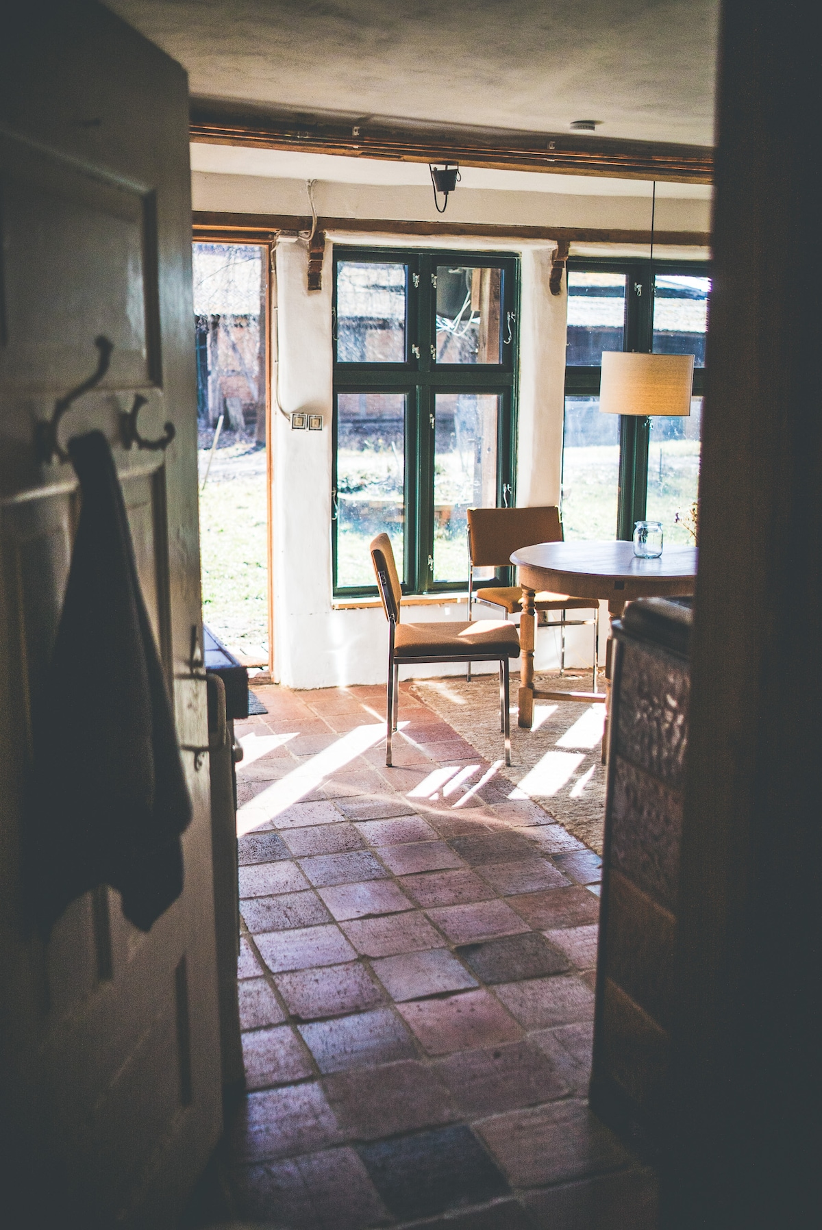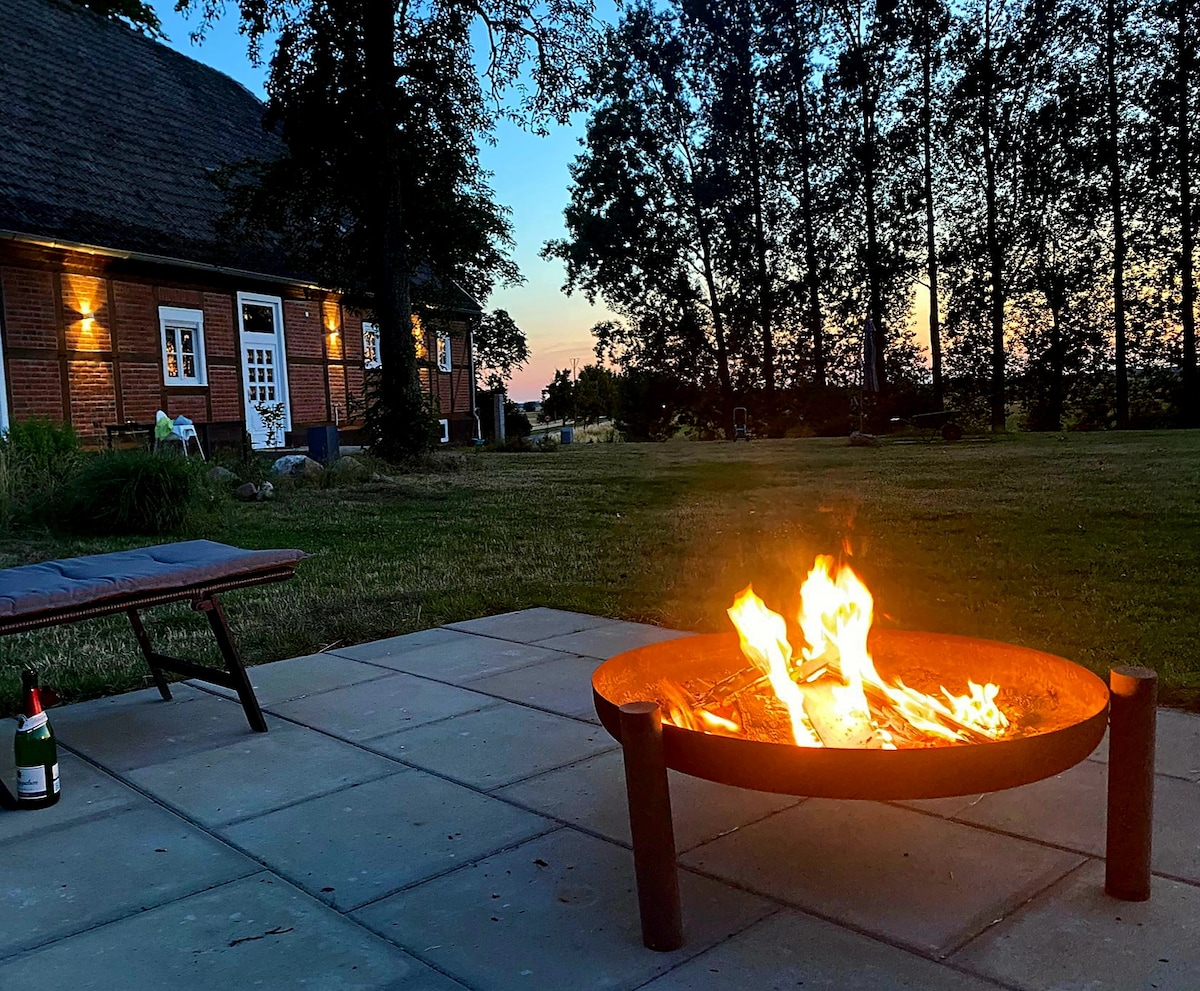Für exzessive Partys ist unser Hof leider nicht geeignet. Unser Haus wurde ca. 1850 erbaut. Wohnhaus & Scheune des denkmalgeschützten 3-Seiten-Hofs sind im Eichen-Fachwerk errichtet. Um das Haus stehen 10 Hochzeitslinden. Im November, wenn die Linden zurückgeschnitten sind, ist das Haus in seiner ganzen Pracht zu sehen. Ab Mai verschwindet es dann langsam hinter schattenspendendem Blätterwerk, und bleibt so den ganzen Sommer herrlich kühl...