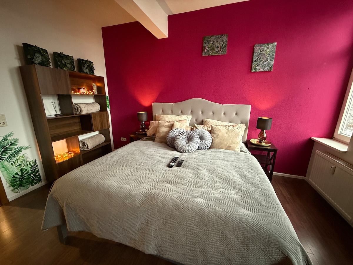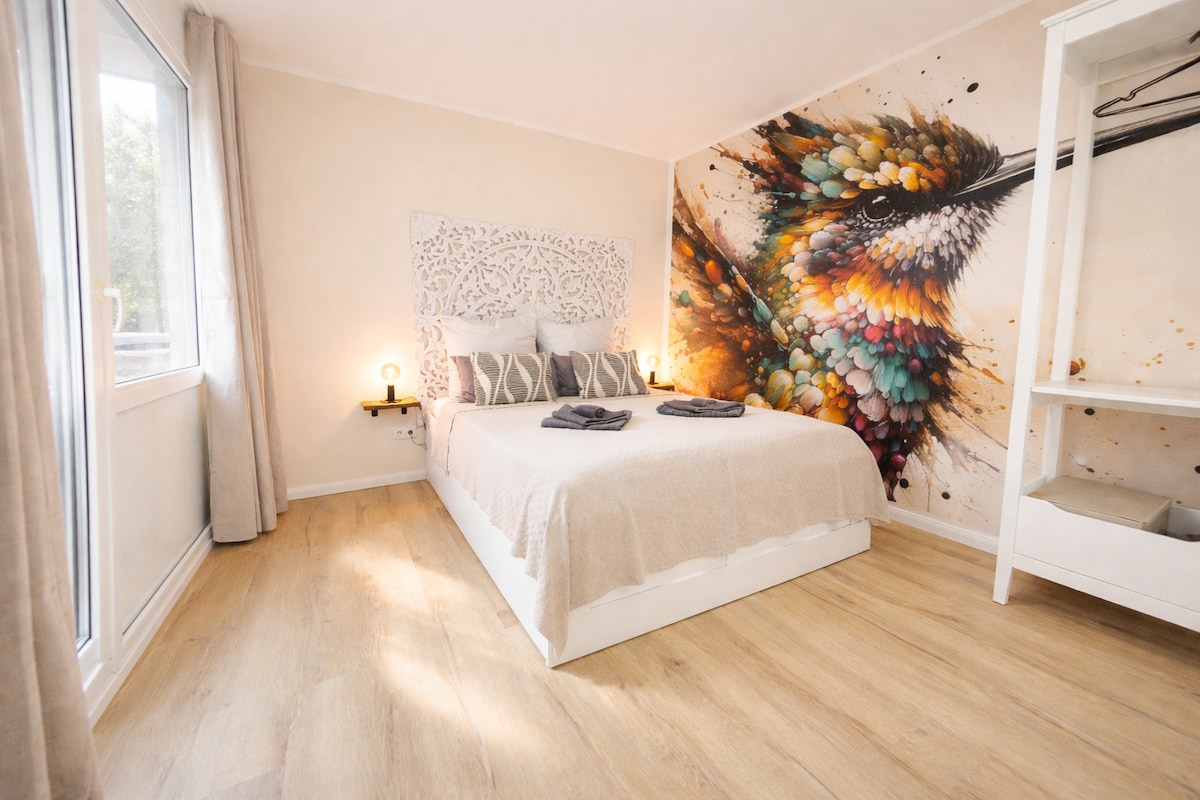 Unsere Wohnung befindet sich in der 1 OG direkt in der Hagenstrasse. Die Wohnung besteht aus 2 Schlafzimmern. Bei Bedarf kann Klappbett zu verfügung gestellt werden, sodass 4 Personen hier übernachten können. Das Doppelbett ist 180 x 200 cm. Hier finden Sie ebenso Bad mit der Dusche, Arbeitsplatz, einen Stauraum, sehr große private Terrasse mit Lounge Möbel und kleinen Tisch mit Stühle, Fernseher mit Dysney+ und Netflix. Genieße ein stilvolles Erlebnis in dieser zentral gelegenen Unterkunft.