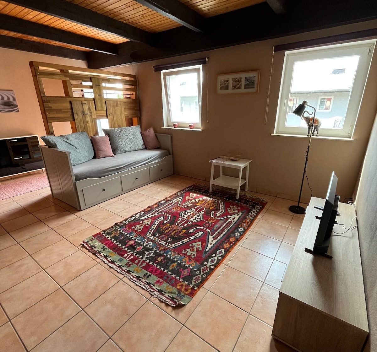 Sonnig, großer Garten, familienfreundlich und Feuerstelle: Die schöne Ferienwohnung in einem ausgebauten Stall ist ideal für Menschen, die Ruhe, Auslauf und Natur suchen. Ihr könnt Lagerfeuer machen, Fahrradausflüge oder in der Gaube sitzen und die unverbaute Aussicht über Garten und Weiden genießen. Ein schöner Badesee ist per Fahrrad zu erreichen. WLAN (ca. 23/7 MBits) und Waschmaschine sind ebenso vorhanden wie zwei eigene Eingänge. Die Sauna kostet 10€ für 2 Stunden, jede weitere Stunde 5€.