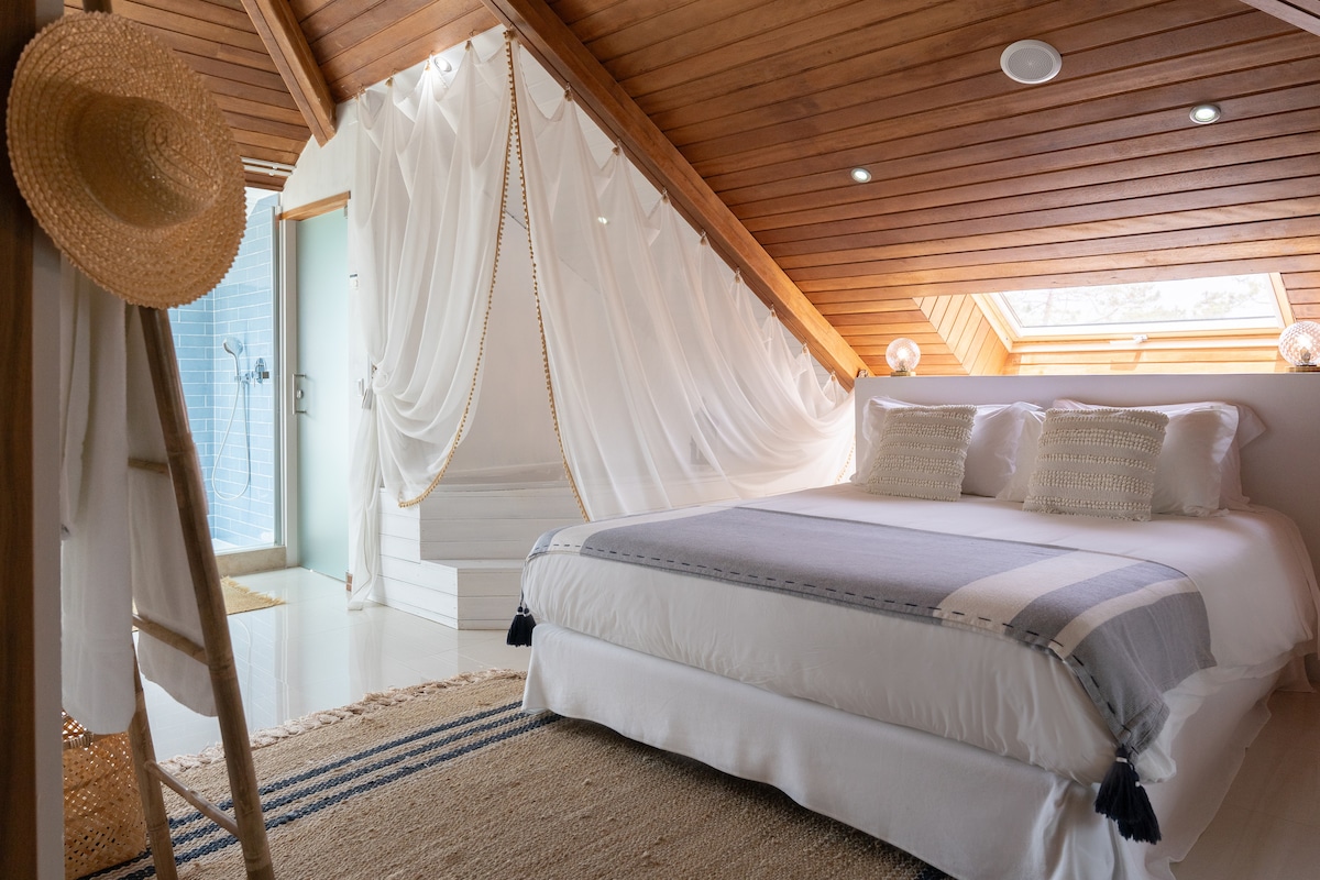 Located at the top of Joy Beach House, this room features an indoor and an outdoor bathtub, a large terrace to soak up the sun's rays or enjoy the breathtaking view. By booking this room you can enjoy our relaxing heated pool and jacuzzi, breathe the fresh air that comes from the forest on the terraces, read a book or enjoy a drink at the honesty bar or just let the time go by. *Adults Only