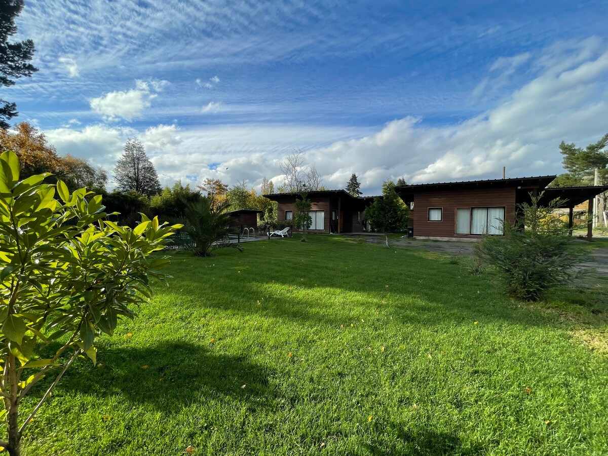 Les ofrezco un espacio de 2500 mtr2 de áreas verdes, espacio para barbacoa y un riachuelo apto para refrescarse. El espacio es solo para usted, no se comparte con otros huéspedes o con más cabañas. La casa es de 50mtr2, equipada con todo lo necesario para una estadía comoda. Se ubica a 300 mtrs de autopista 5 sur, camino a la Aguada con excelente acceso pavimentado. Las cataratas del los Saltos del Laja se encuentran a 2 minutos.