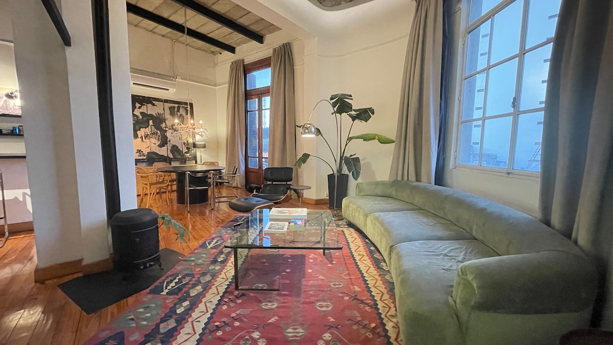 Located in the historical Pasaje Santamarina, close to the heart of San Telmo, and reached through one flight of stairs, it has a living area with a fireplace and an integrated kitchen, 2 bedrooms (one in an open mezzanine, with a desk), an entertainment center with an LCD TV (with Chromecast, no cable), a bathroom (with shower box, no tub), and a walk-in closet. Features Wi-fi connection and a central air conditioning system. Very quiet and light-filled. Easy access to Buenos Aires attractions.