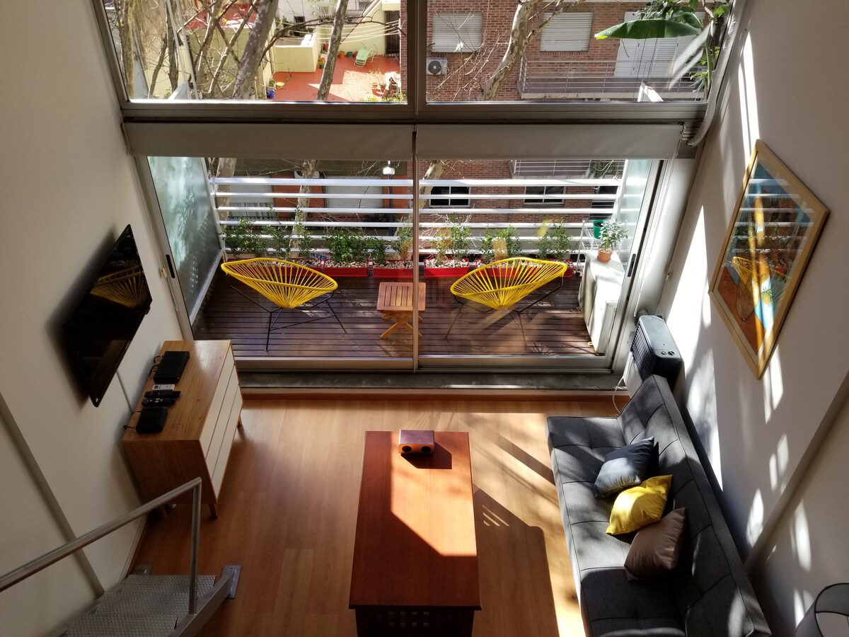 El living-comedor y el dormitorio principal se abren a la terraza, que da a la calle y el departamento es super luminoso. El segundo dormitorio es un entrepiso que balconea hacia el living. No tiene espacios comunes , solo el hall de acceso. Rodeado de los mejores bares, boutiques de diseño y restaurantes, esta ubicado a una cuadra de plaza Serrano. El departamento se encuentra en una calle tranquila y arbolada