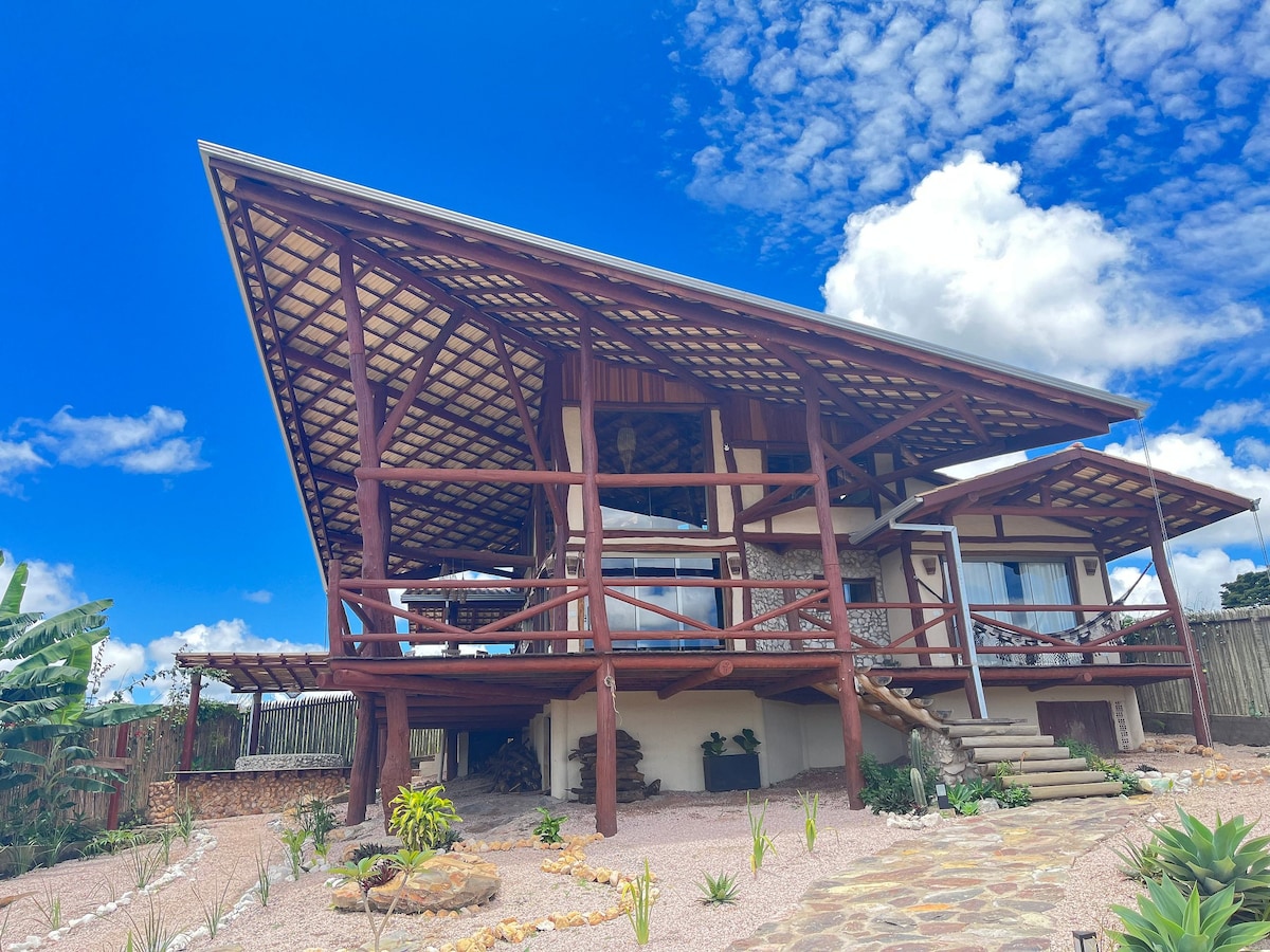 Linda casa com uma arquitetura ecológica em bambu e adobe. Para quem gosta de estar em contato com a natureza, sobrevoado por araras e tucanos, c/ uma bela vista do nascer do sol e da lua refletidos nas montanhas. • Perfeito para 2 pessoas, 1 quarto cama de casal e 1 sofa-cama no mezanino; • Smart TV no quarto. • Alexa • Banheira de imersão externa • 1,2 km do centro de Alto Paraíso; • café da manhã opcional • Excelente localização p/ quem gosta de tranquilidade, ao mesmo tempo perto do centro
