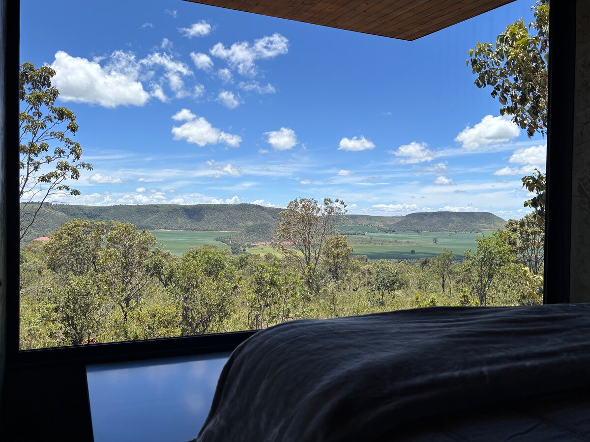 Voted the best pousada in Goiás and top 10 in Brazil! One-of-a-kind accommodation on a luxury ranch in the Chapada dos Veadeiros with breakfast included and jacuzzi bathub. We have 5 chalés. Located 15km from the center of Alto Paraíso on 92,000m2 of native Cerrado land with breathtaking views. Our chalets have air conditioning, 400 thread count sheets, Natura amenities, full kitchen, fire pit, 150mbps WiFi and 40" Smart TV. Try feeding our llamas or a sunset horseback ride! Kids welcome.