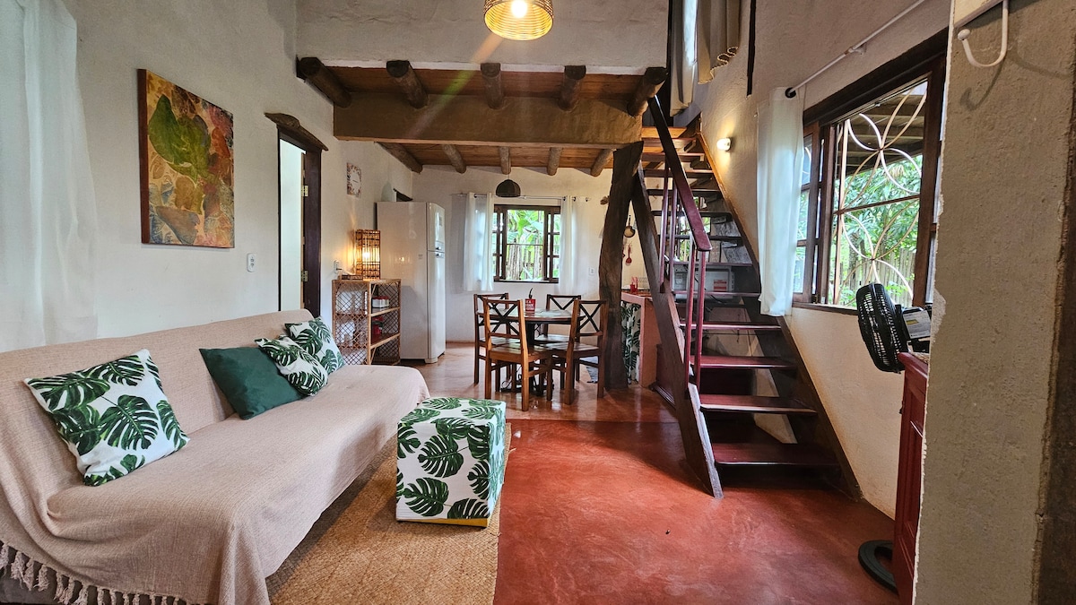 Super charming house and very central, in the middle of nature :) Rustic and comfortable, draws attention for its ceramic details and distinct materials, with a touch of natural and contemporary creativity. A colorful environment to rejuvenate your spirit and soul, with the advantage of being right in the center and doing everything on foot. • Double bedroom and double sofa bed in living room • Full kitchen and WiFi; • Nature and tranquility; • 100m main street; kisses, Dana
