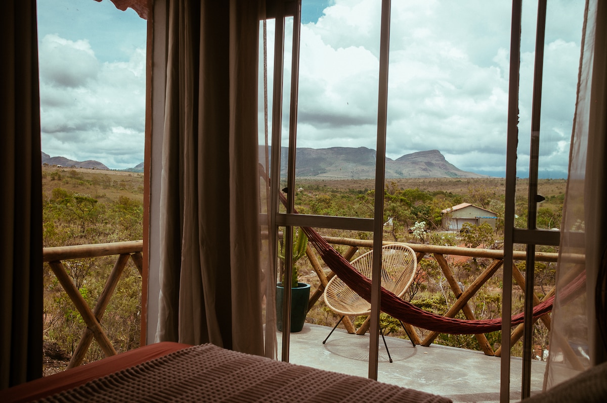 Voted the best pousada in Goiás and top 10 in Brazil! One-of-a-kind accommodation on a luxury ranch in the Chapada dos Veadeiros with breakfast included and jacuzzi bathub. We have 5 chalés. Located 15km from the center of Alto Paraíso on 92,000m2 of native Cerrado land with breathtaking views. Our chalets have air conditioning, 400 thread count sheets, Natura amenities, full kitchen, fire pit, 150mbps WiFi and 40" Smart TV. Try feeding our llamas or a sunset horseback ride! Kids welcome.