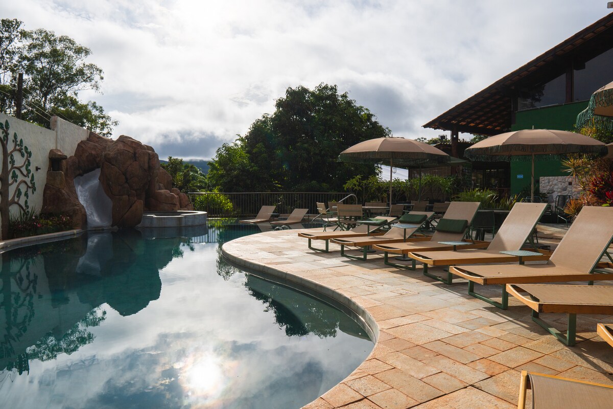 Com uma maravilhosa vista do vale e das montanhas e uma area para contemplação com banheira de hidromassagem privativa e piscina compartilhada, a Cabana Pouso Alto foi inspirada na arquitetura típica da região da Chapada dos Veadeiros. Construída com paredes de tijolos ecológicos de adobe, estrutura de eucalipto de reflorestamento e piso de cimento queimado, ela proporciona a seus visitantes a verdadeira experiência de viver e sentir a vida como ela é em meio ao cerrado. Piscina compartilhada