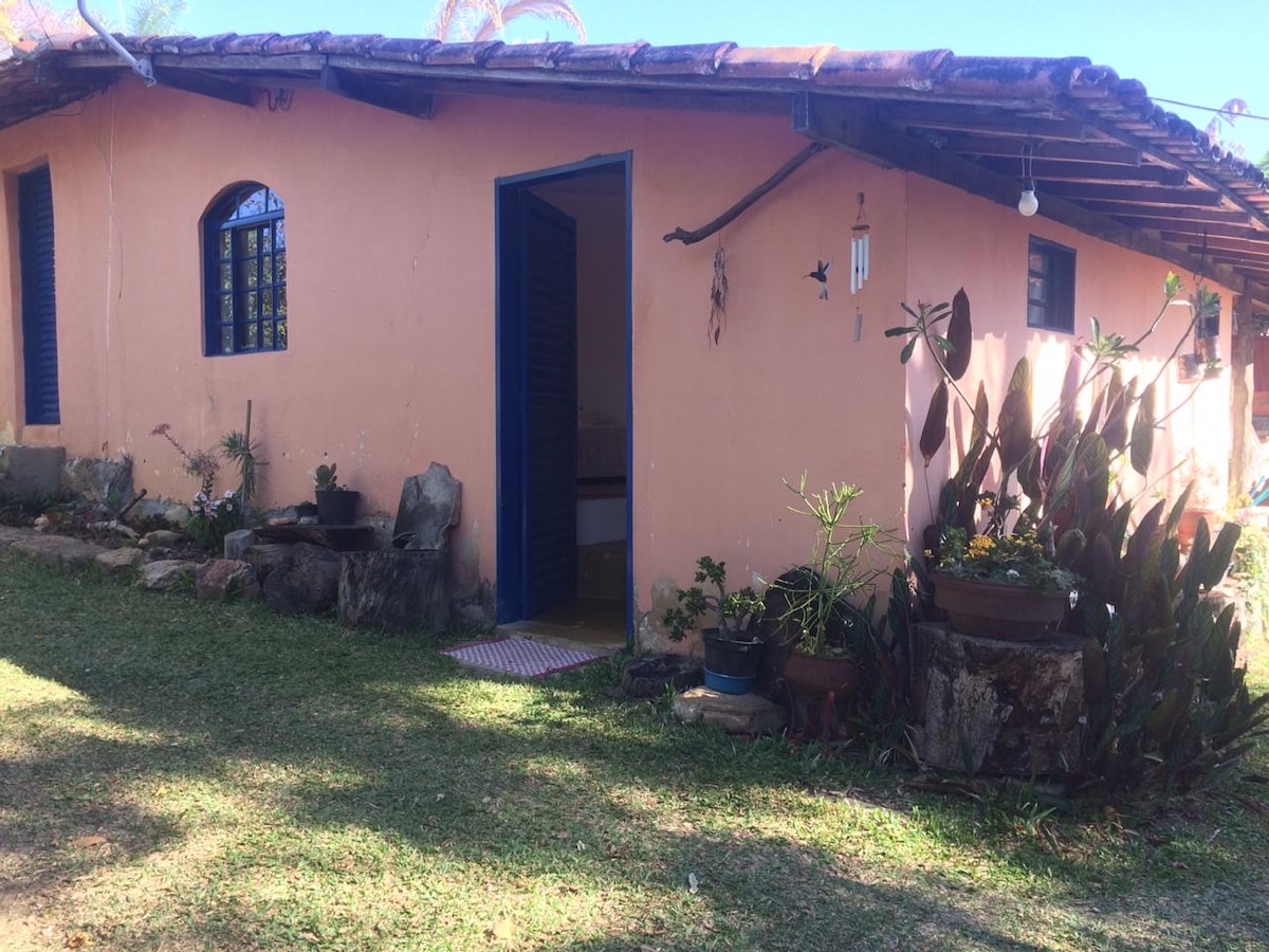 A place to rest away from the noise of the city, with the comfort of a house and an additional servisse of cleaning and breakfast, charged separately. Come relax in the silence and on one of the most starry nights, surrounded by nature, woods, lush birds and orchards with fruit harvested from the foot. • 2 km from the center of Alto Paraíso; • 3 people, 1 double suite and 1 sofa bed; • Bed linen and bath included; • Equipped kitchen and wifi;