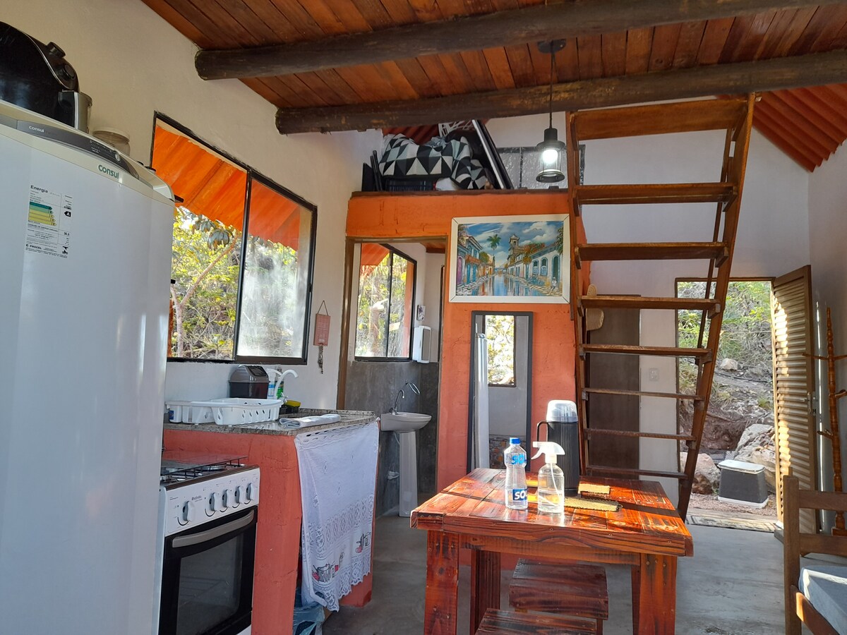 A cozy and refined chalet with a mezzanine, fine finishes and a kingsize bed. On the ground floor there is a large living room, work desk, kitchen and living room and a beautiful and spacious bathroom, with a double sofa bed. It has a balcony with a beautiful view and an outdoor shower. Pure spring water in every faucet, amazing views from the windows. Outside a trail leads straight to a private waterfall All this in the midst of thousands of hectares of untouched Cerrado and rich wildlife.
