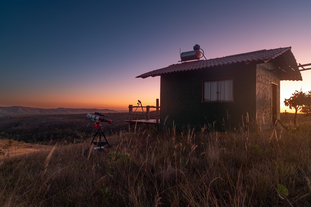 Bem vindo ao Chalé Lobeirinha, com vista panorâmica e ao lado do pé da Lobeira, árvore nativa do Cerrado! Aqui você vai avistar diversas espécies de aves, uma vista para o nascer do sol e um céu estrelado 360º. Um estilo de vida repleto de natureza e muita tranquilidade. > Privacidade e sossego apenas 5 min. do Centrinho > Vista exclusiva para o nascer do sol, pôr do sol e nascer da Lua cheia > Cozinha e Wifi e Smart TV. > Oferecemos roupa de cama e banho