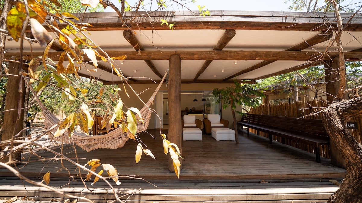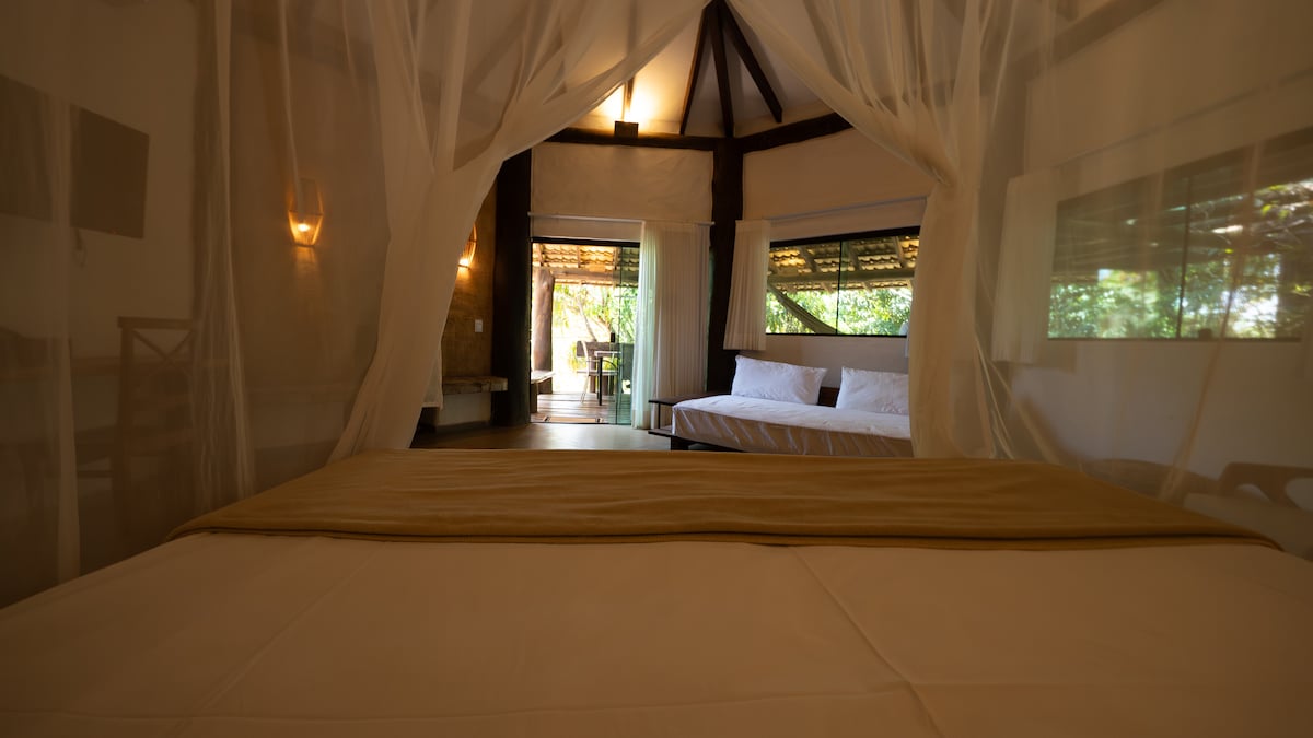 O Bangalô Inaê é um mergulho em conforto e alma brasileira. Com 80 m² de pura inspiração, une arquitetura autoral com uma vista que se abre como um quadro vivo. Lençóis de 1000 fios para o máximo conforto. Cozinha completa e banheira de imersão, mas a verdadeira celebração vem com nossa piscina natural com agua ozonizada, um lindo deck, sauna e um pequeno café da manha cortesia preparado por nossa Chef. Ideal para quem busca uma experiência de imersão no cerrado nativo com conforto.