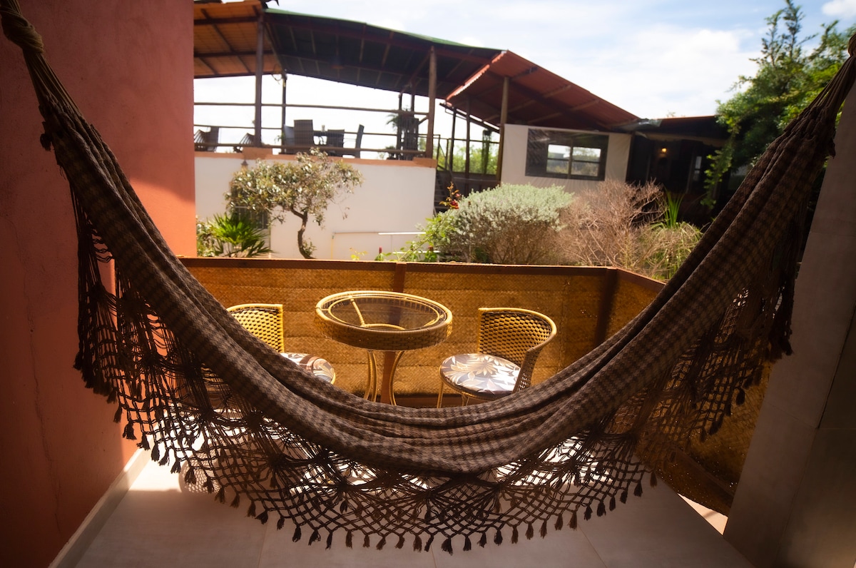 A Casa Vento é um chalé privativo encantador, perfeito para quem busca conforto e praticidade. O espaço acomoda com conforto até 4 pessoas e conta com uma varanda deliciosa com vista para a Serra da Baliza, um convite para contemplar o pôr do sol ou simplesmente relaxar. Durante a estadia, você pode aproveitar toda a estrutura da pousada, que inclui uma piscina rodeada por natureza, sauna, ducha e um delicioso café da manhã incluso na diária, sempre fresquinho e preparado com carinho.