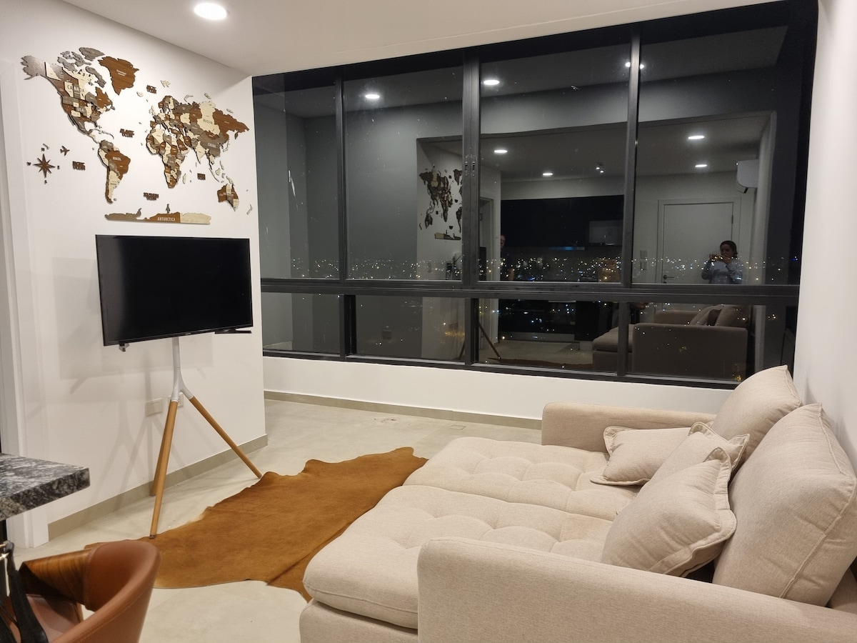Relájate en este espacio tan tranquilo y elegante, con una hermosa vista de la ciudad. Disfruta de la conexión de wifi de alta velocidad y disfruta de tus peliculas con un moderno TV Smart y de un balcón privado y churrasquera . Dependencias todas con sistema de Aire Acondicionado. Cocina completamente amoblada con anafe a inducción, horno eléctrico, tostadora, microondas y cafeteras. Estacionamiento cubierto dentro del edificio con portería las 24 hrs,.