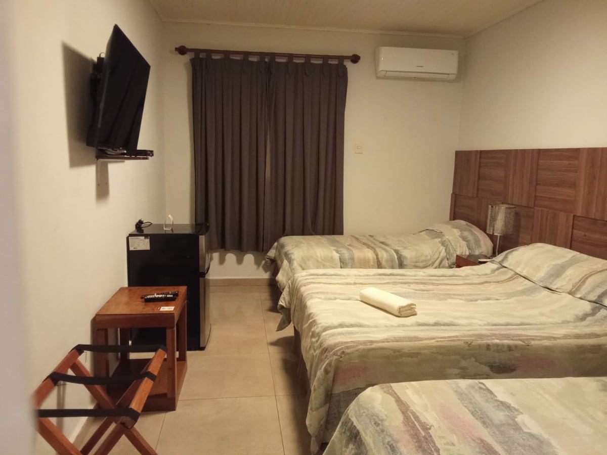Hotel room with air conditioning, wifi and cable TV Great space for small or big events Location: km 11-Acaraya dos cuadras de la Ruta Internacional 1 min walk from supermarket, pharmacy (Nicol Farma), and bar (Eleven Bar) 3 mins walk from Lactolanda (Ice cream shop) 1 min away from gas station (Integral Service Station) 3 blocks from Parque Industrial KM 11 (7 mins away by car) 8 mins away by car there is a fishing place (Grupo Mar Pesque & Paque- Restaurante-Frigorífica)