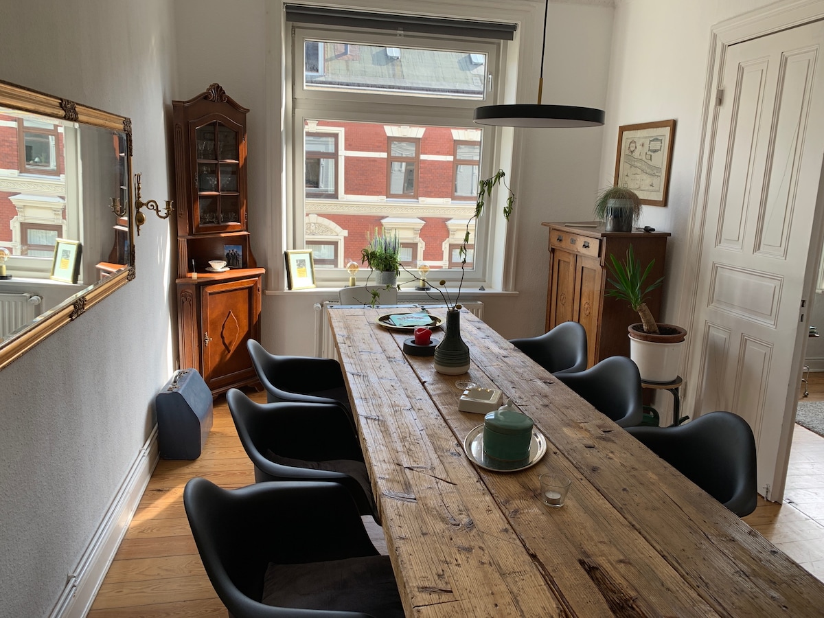 New opening 9/2020. Beautiful, sunny apartment in Waterloohus in quiet side street on the edge of the Schanzenviertel. Stay in an old merchant's villa built in 1885 and renovated in 2020 in a quiet residential street. Old building charm with modern hotel-like atmosphere, improved sound insulation and well-equipped kitchen. Within walking distance are numerous bars and restaurants of the popular trendy neighborhood Sternschanze. Child-friendly district with many playgrounds.