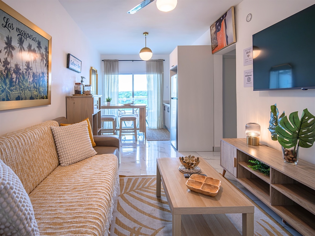 Bienvenido a tu hogar en Bayahibe . Este acogedor apartamento de 1 dormitorio en primer nivel está diseñado para que vivas una experiencia de vacaciones cómoda y relajada. Disfruta del descanso que mereces en una cama king size, de un espacio totalmente equipado para que no te falte nada, y de una amplia terraza privada con vista a la piscina, perfecta para tomar el sol, compartir en pareja o simplemente dejarte llevar por la tranquilidad del lugar.