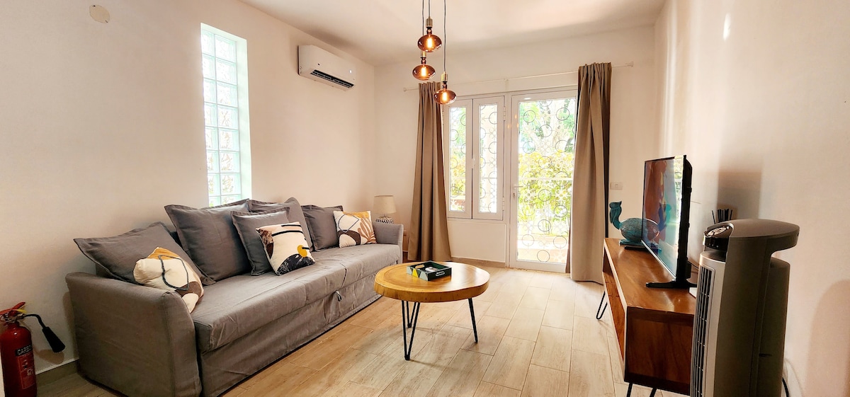 Hier fühlt man sich wohl, denn es ist gepflegt, geschmackvoll und mit neuen Möbeln ausgestattet. Im Schlafzimmer hat es sehr grosse Einbauschränke, da haben neben den Kleidern sogar noch alle Koffer Platz! Das Bett ist sehr bequem. Die Küche hat alles, was man braucht und die Bar ist sehr einladend. Das Bad ist sehr gross und es gibt Platz, um all seine persönlichen Toilettenartikel zu versorgen! Das Beste ist die super grosse Terasse, mit Tisch, Sofa, schönen Pflanzen! Wunderbare Abendsonne!
