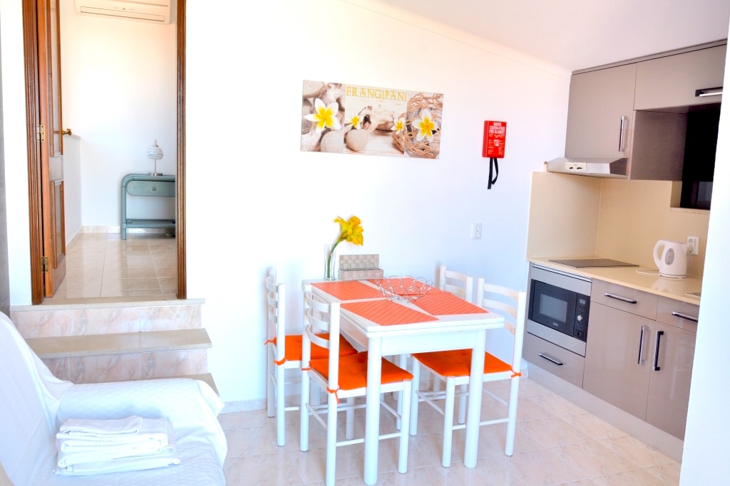 Apartamento T1 num condomínio fechado, na 1ª linha da Praia da Alagoa, com vista mar, piscina, estacionamento privado, terraço de 60 M2, 1 quarto com cama de casal e tv, sala com sofá e cama de casal e tv, wc e cozinha totalmente equipada, ar condicionado e Wi-Fi
