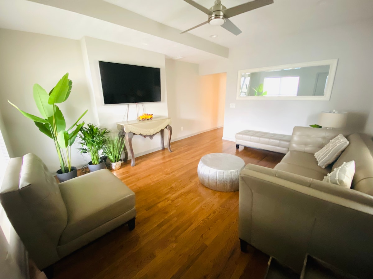 The spacious dining room has a large butcher block table with lots of seating. The brand new kitchen is fully equipped for your stay. It has stainless appliances, quartz & butcher block countertops and barstool seating. The house is WiFi equipped with 3 TV sets.