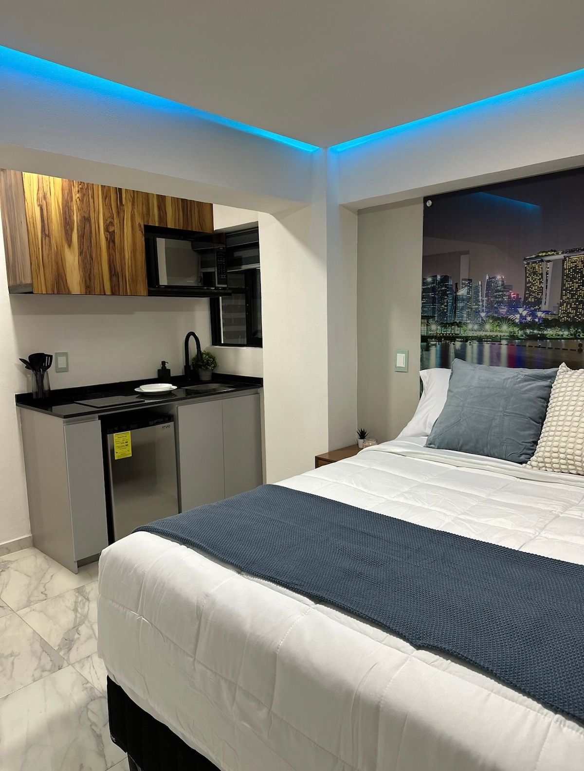 Estudio de 33m2, ideal para un viaje corto a la zona de Santa Fe, cuenta con 1 cama king, smart tv, barra de servicios (microondas), smart tv con internet y baño propio. El espacio lo recomiendo para viajeros que buscan pocas noches de hospedaje. Limpieza diaria y 1 cajón de estacionamiento incluido. **El espacio no se compate con nadie*** **Edificio con seguridad y recepción 24/7**