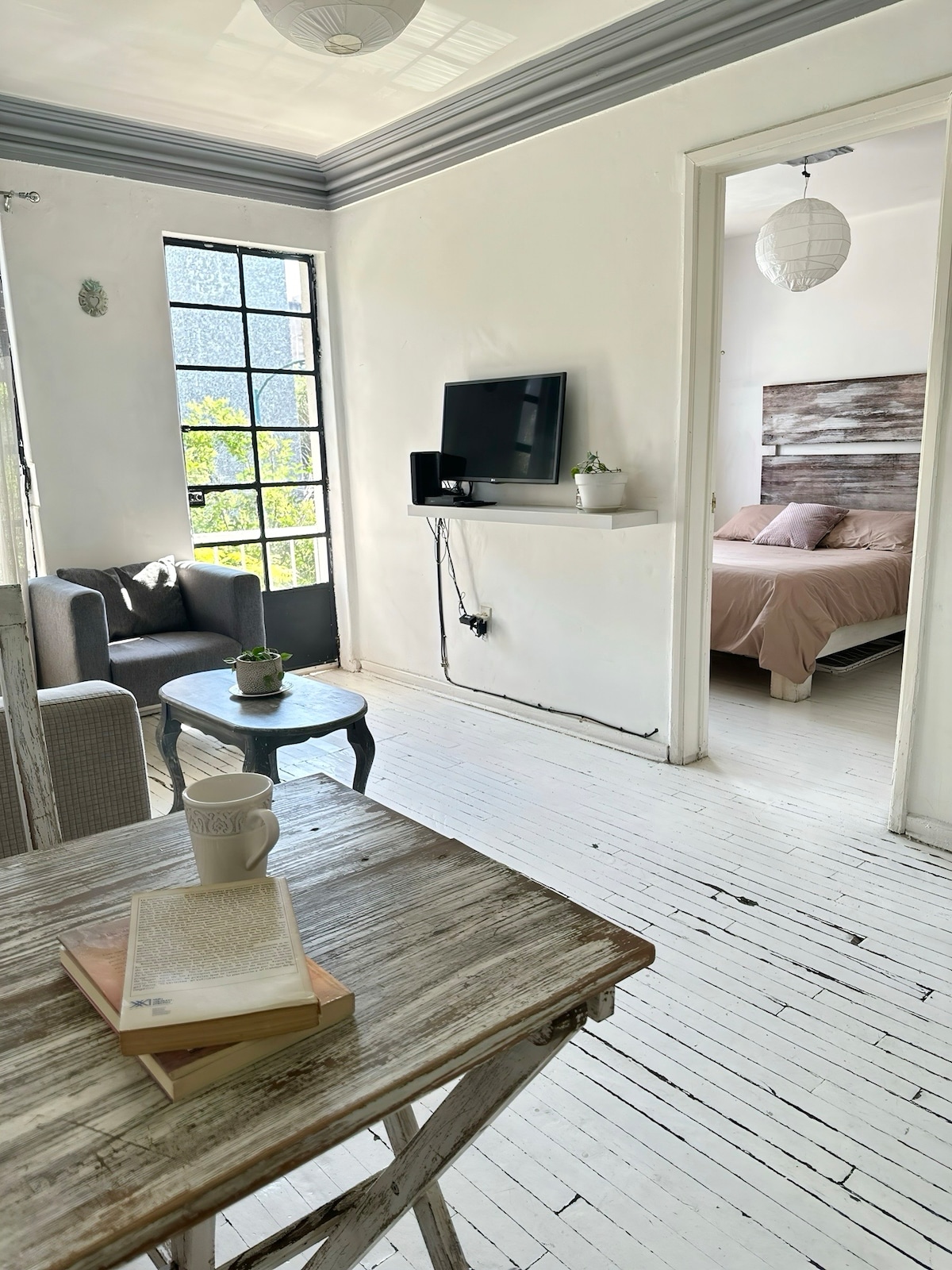 Located in the heart of Roma Sur, this bright and airy boho flat is filled with natural light all day. A calm, stylish space just a 15-minute walk to Condesa and Roma Norte. Full apartment (second floor, no elevator). Perfect for couples, digital nomads and travelers seeking a cozy place to unwind or work remotely. Queen bed, equipped kitchen, laundry area and fast WiFi. Designed to make you feel at home.