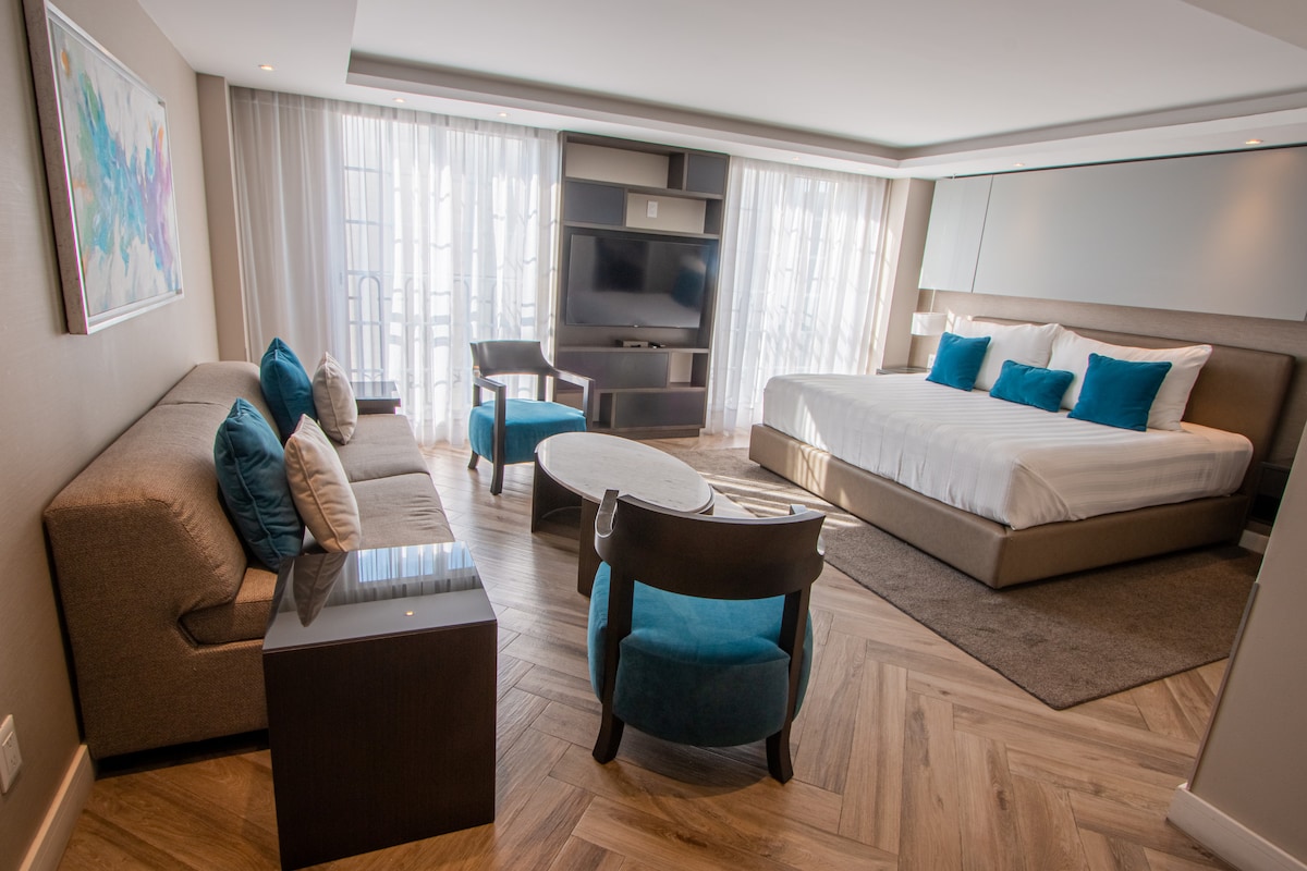 Ubicado a 2 calles del Angel de la Independencia, este apartahotel te dejará boquiabierto! Las suites dobles miden alrededor de 68 m2, con 2 camas queen size, sofá cama matrimonial, cocina equipada, escritorio de trabajo, pantalla de 55 pulgadas, baño con regadera y closet con caja de seguridad. Algunas de las características pueden variar ligeramente dependiendo de la suite asignada. Contamos con roofgarden con jacuzzi, bar, asoleadero, mesas y comida. Estacionamiento sujeto a disponibilidad.