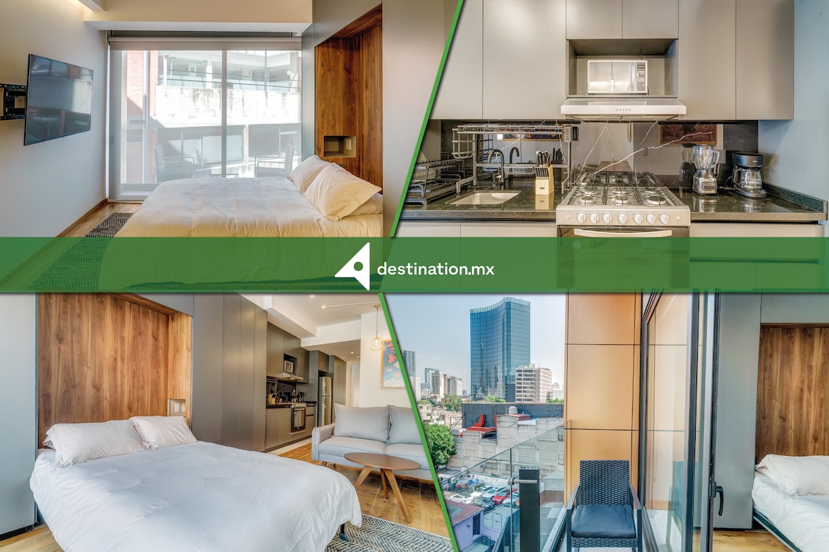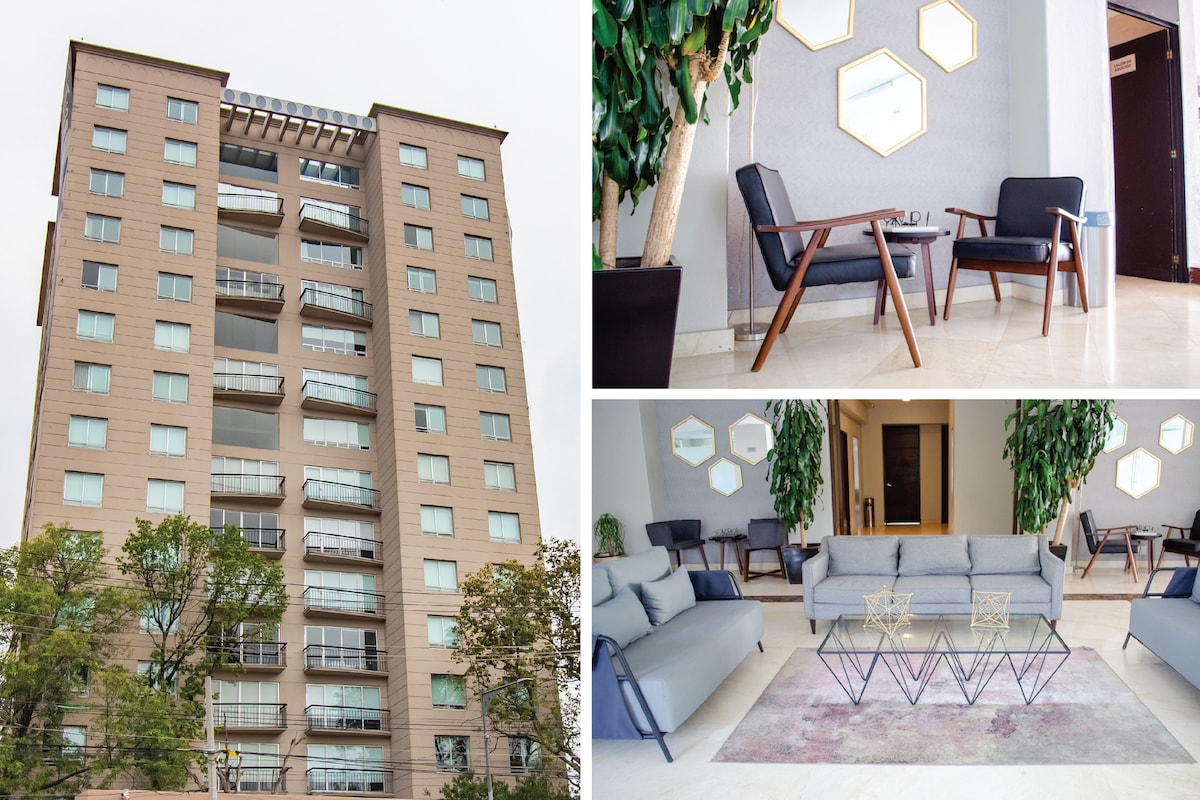 El loft con balcón privado, gimnasio y coworking: se encuentra en una posición estratégica de regeneración urbana, a 7 minutos a pie de la estación de metro y las áreas más interesantes de la ciudad (Condesa, Juarez, Reforma y Polanco). Cuenta con comodidades modernas como control automatizado con Alexa, una cama de memory foam y una regadera con hidromasaje. Además, ofrece estacionamiento en el sótano y vigilancia las 24 horas. Todo el loft está alimentado por energías renovables.