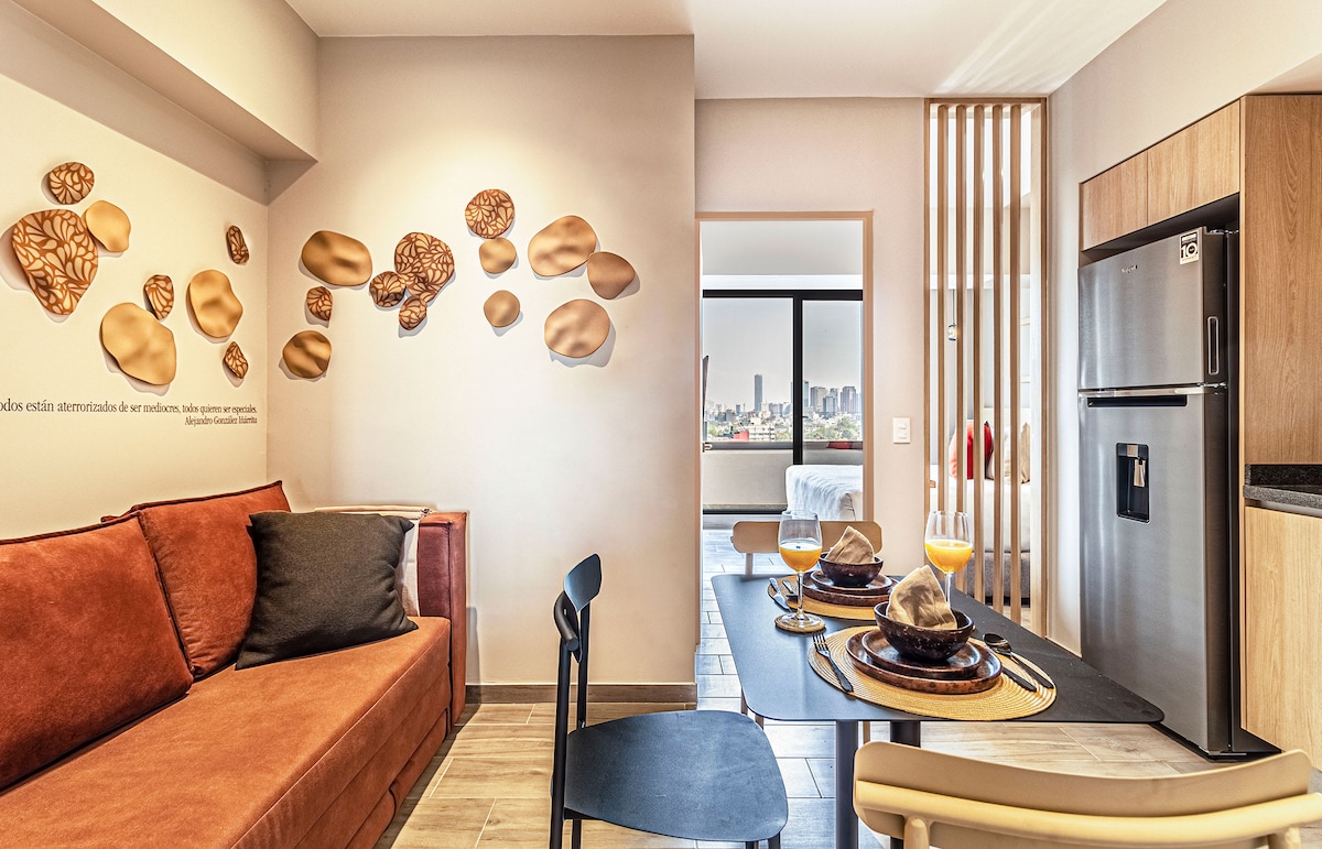 You’re about to discover your next stay! We’re thrilled to welcome you to our apartments. This building is not only in a prime location, but it also tells a story that celebrates contemporary Mexican art and culture. From handcrafted Talavera pieces made in Puebla to iconic quotes by renowned Mexican creatives like Octavio Paz and Alejandro González Iñárritu, every corner is designed to inspire you. Plus, you’ll get to enjoy one of the best views in the city.