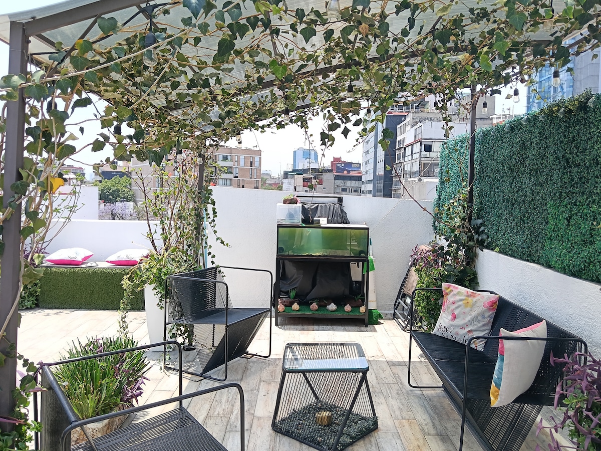 Beautiful loft in a rooftop garden of a family house in Hipódromo Condesa, perfect for two guests. Functional, comfortable and cozy, with a charming private terrace and plenty of natural light. Ideal for those seeking a safe, peaceful, and functional space in a privileged location. The perfect base for exploring the city
