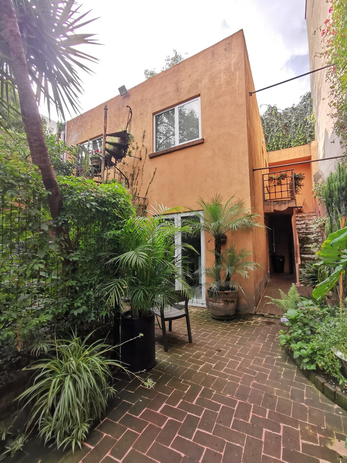 "Mexican traditions", located in a Porfirian building in Roma Norte, decorated with references to Mexican traditions. It has: spacious and equipped bathroom; washing machine strategically located; kitchen equipped with grill, microwave, and refrigerator; dining room with table and chairs for four people; living room with sofa and chairs to relax. Master bedroom with king-size bed, closet, TV and air conditioning. Access to the garden from the living room and bedroom. Ideal for extended stays.