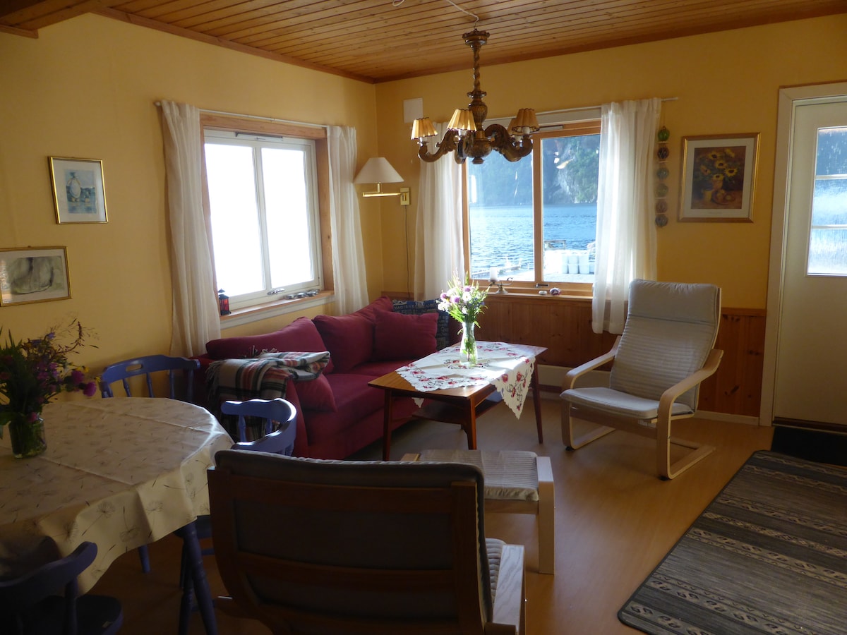Ein triveleg leilighet i rolege og landlege omgivelsar med utsikt mot fjord og fjell. Romslig stove med open løysing til kjøkken med oppvaskemaskin, kombinert kjøleskap og frys. Dør direkte ut på stor terrasse der du kan nyta morgonkaffien eller andre måltid. Kort veg til butikk og busstopp. Turstiar i skog og mark like utanfor døra. 1 km til sjøen der ein kan bada frå svaberg og stupebrett. Eigen parkeringsplass like ved huset. Med eigen bil er det kort veg til mange attraksjonar i regionen.
